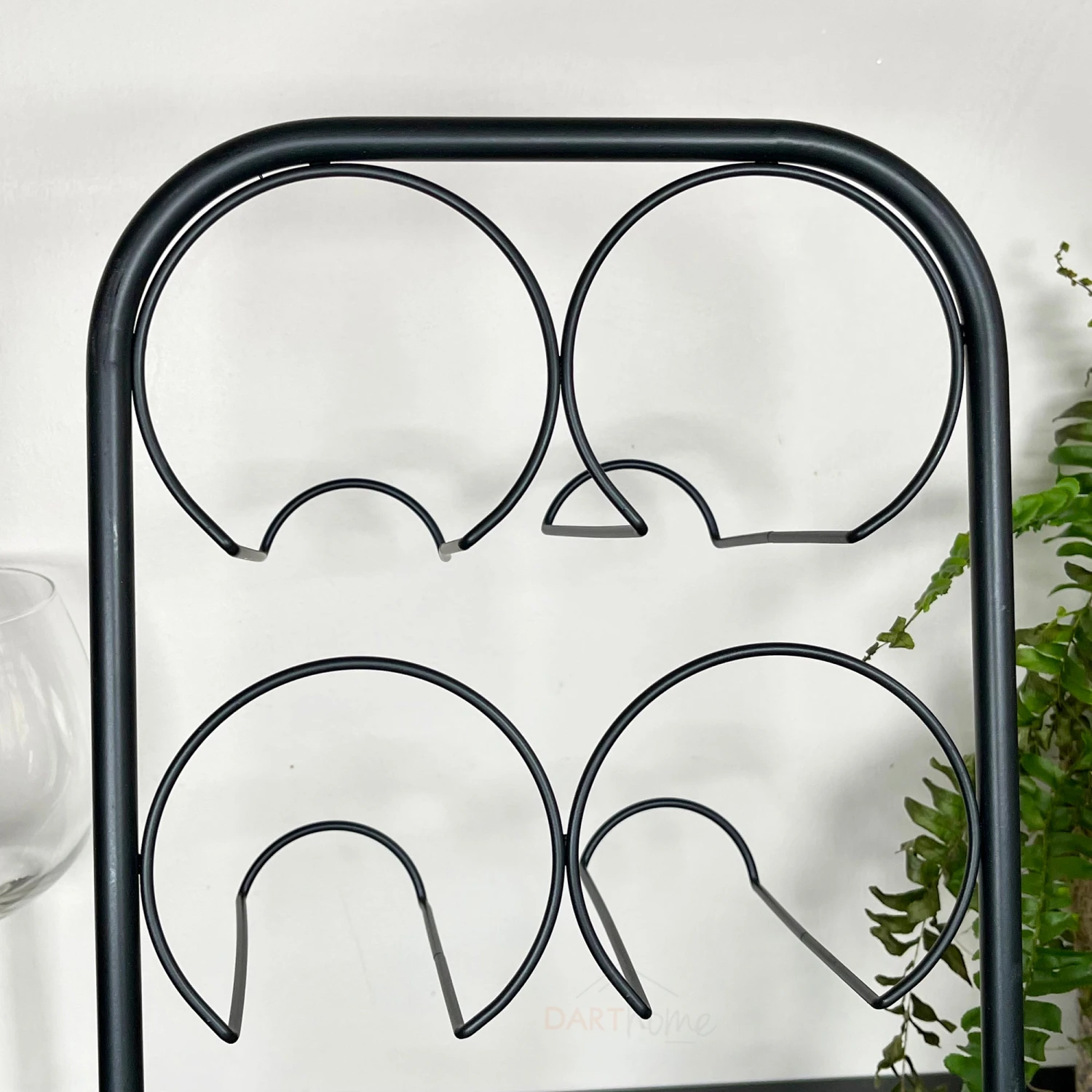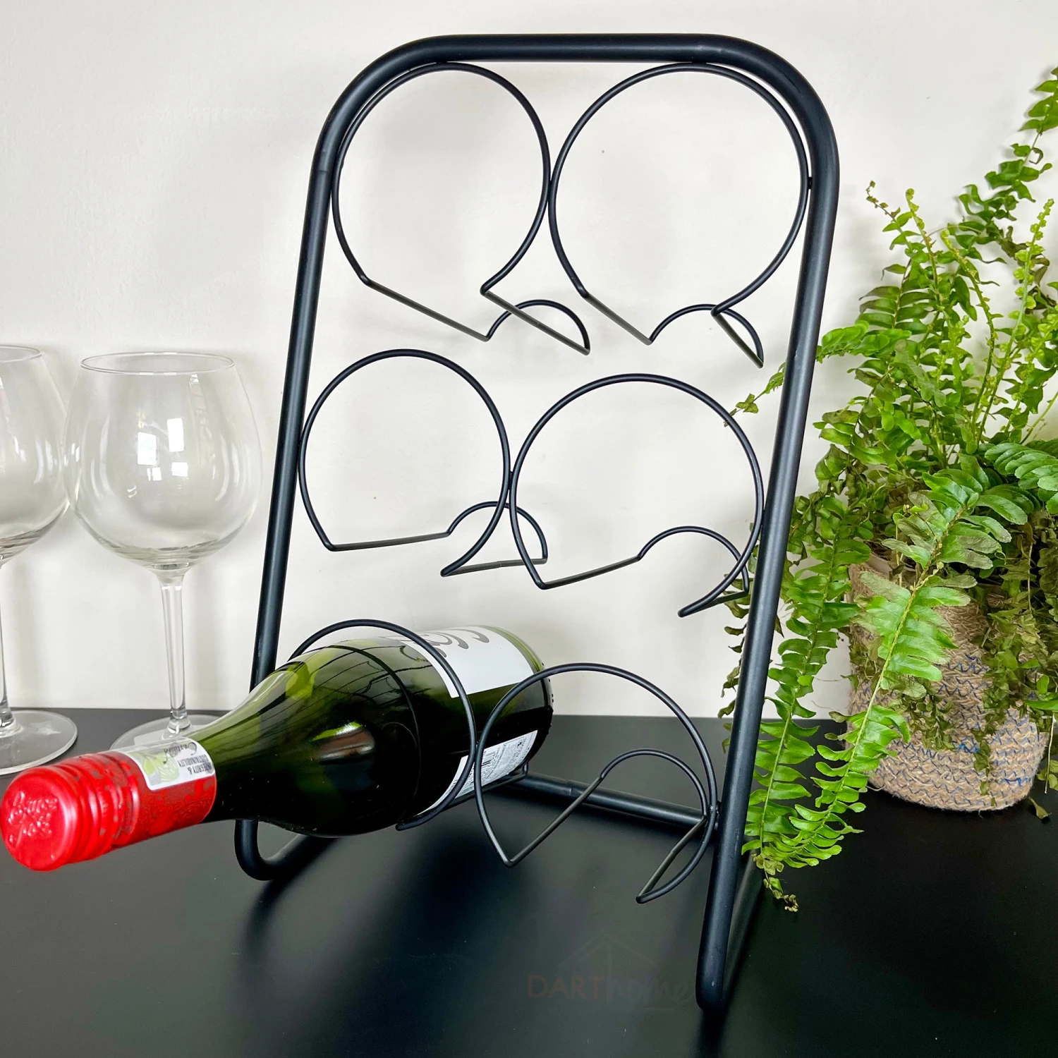 This wine rack, with a 6 bottle capacity is a tabletop or floor storage holder that would look beautiful on your kitchen worktop. It is a symmetrical, freestanding rack made from metal, finished in a deep black modern industrial style.