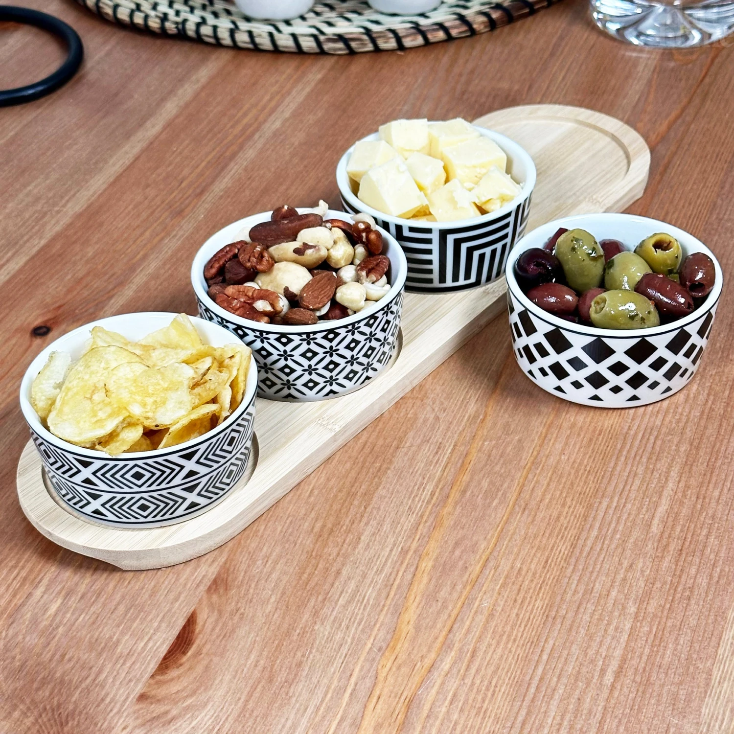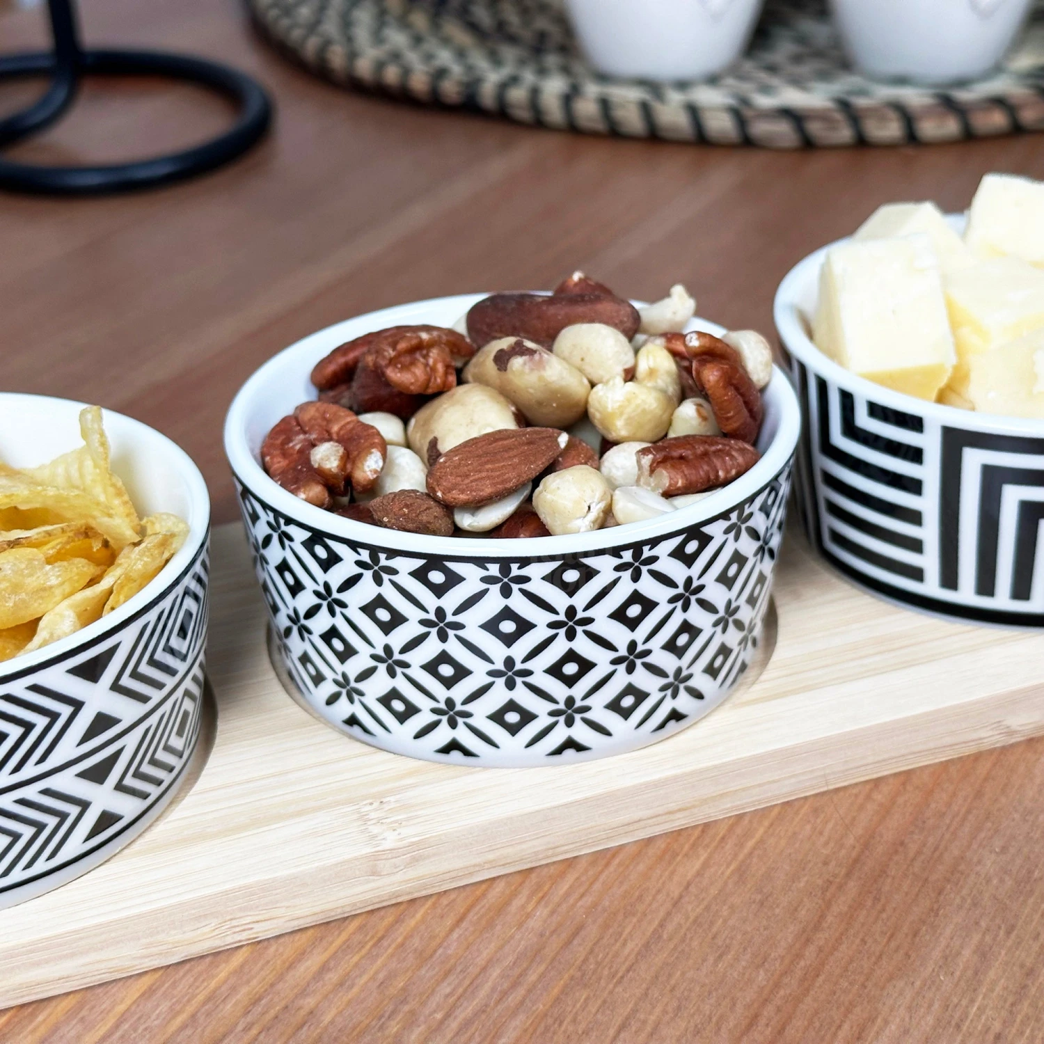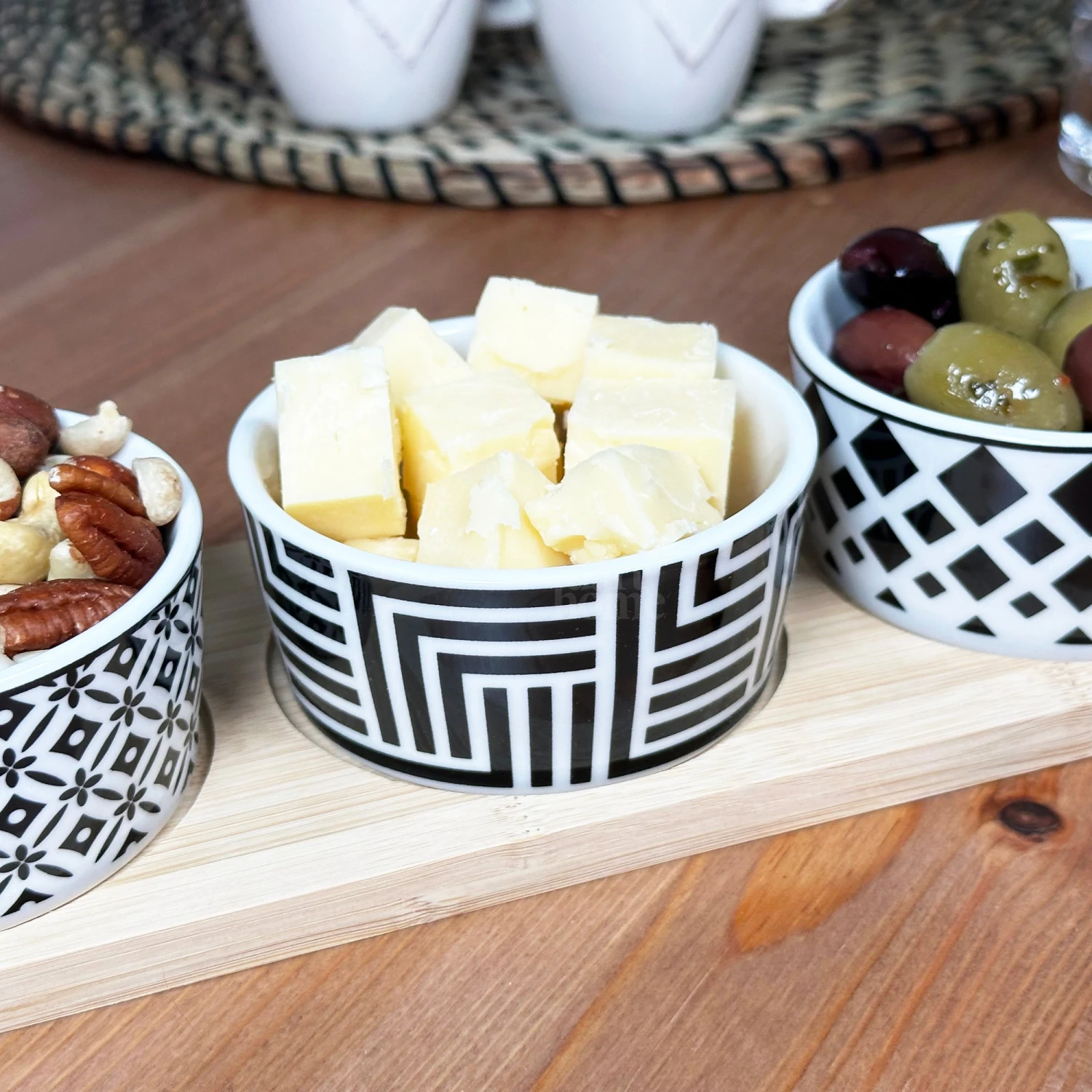 A 5pc monochrome tapas serving set including a bamboo serving tray and 4 ceramic black and white geometric snack dishes. The perfect serving set for feeding your future guests.
