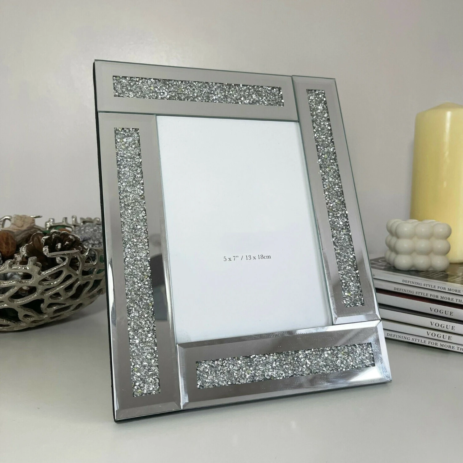 Stunningly elegant freestanding, crushed diamond, sparkly diamante chrome mirrored photo frames, made from glass. Single photo capacity. Rectangular photo picture frame. Perfect gift to give a loved one with a personal photograph inside! Available in: 5×7″. Perfect for the home or bedroom.