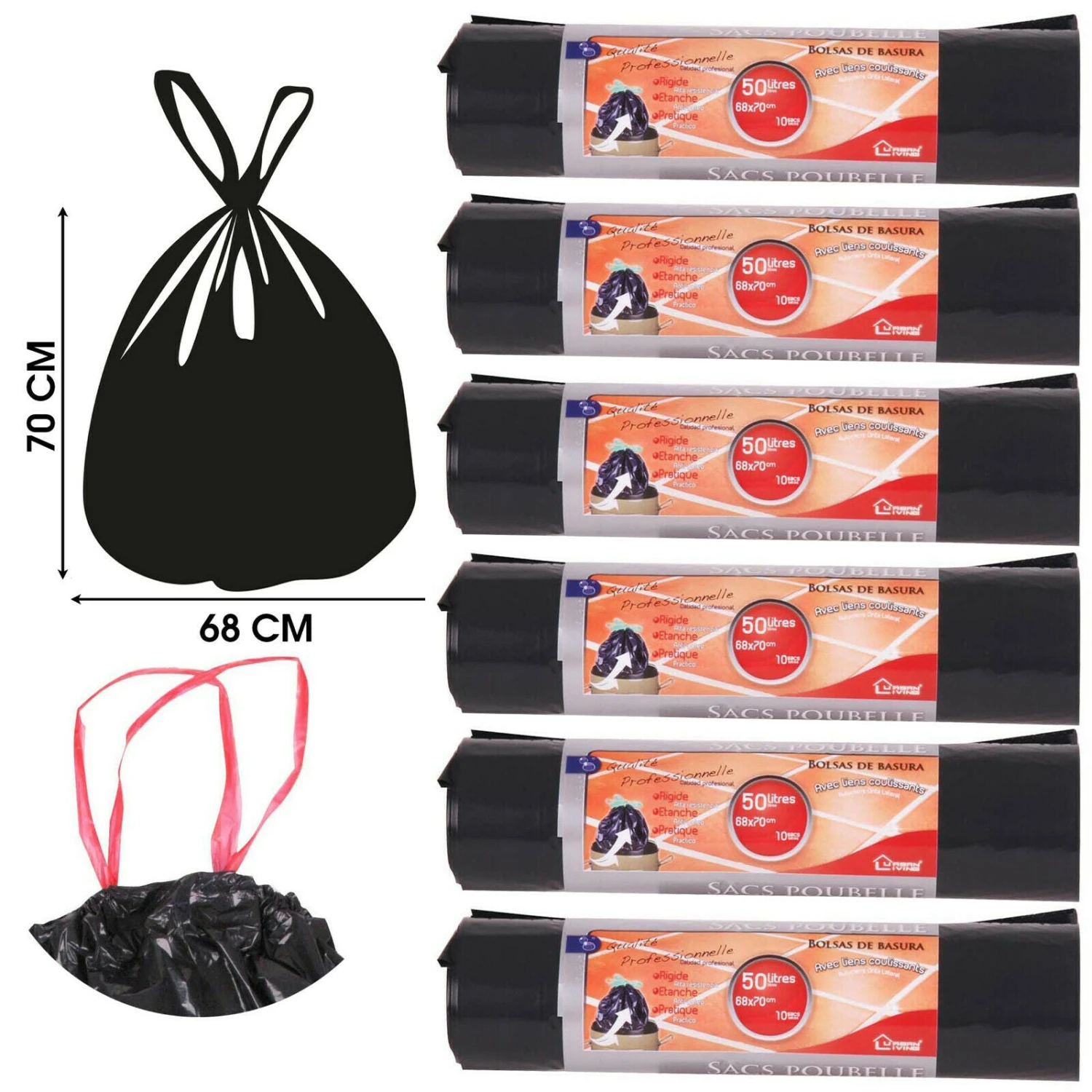 Extra strong black dustbin liners. In this listing you will recieve 6 rolls of 10 bags, totalling 60 bags. These bin bags are heavy duty bags with drawstrings for ease of movement. Can be used for a variety of waste needs, including general, paper and rubbish waste.