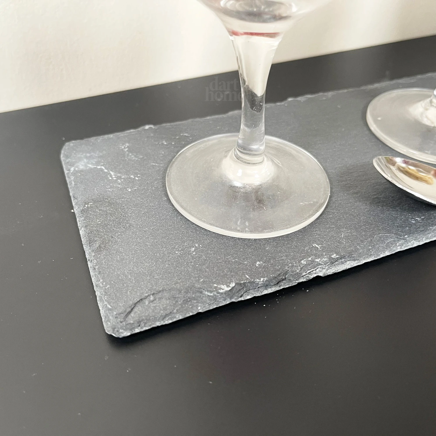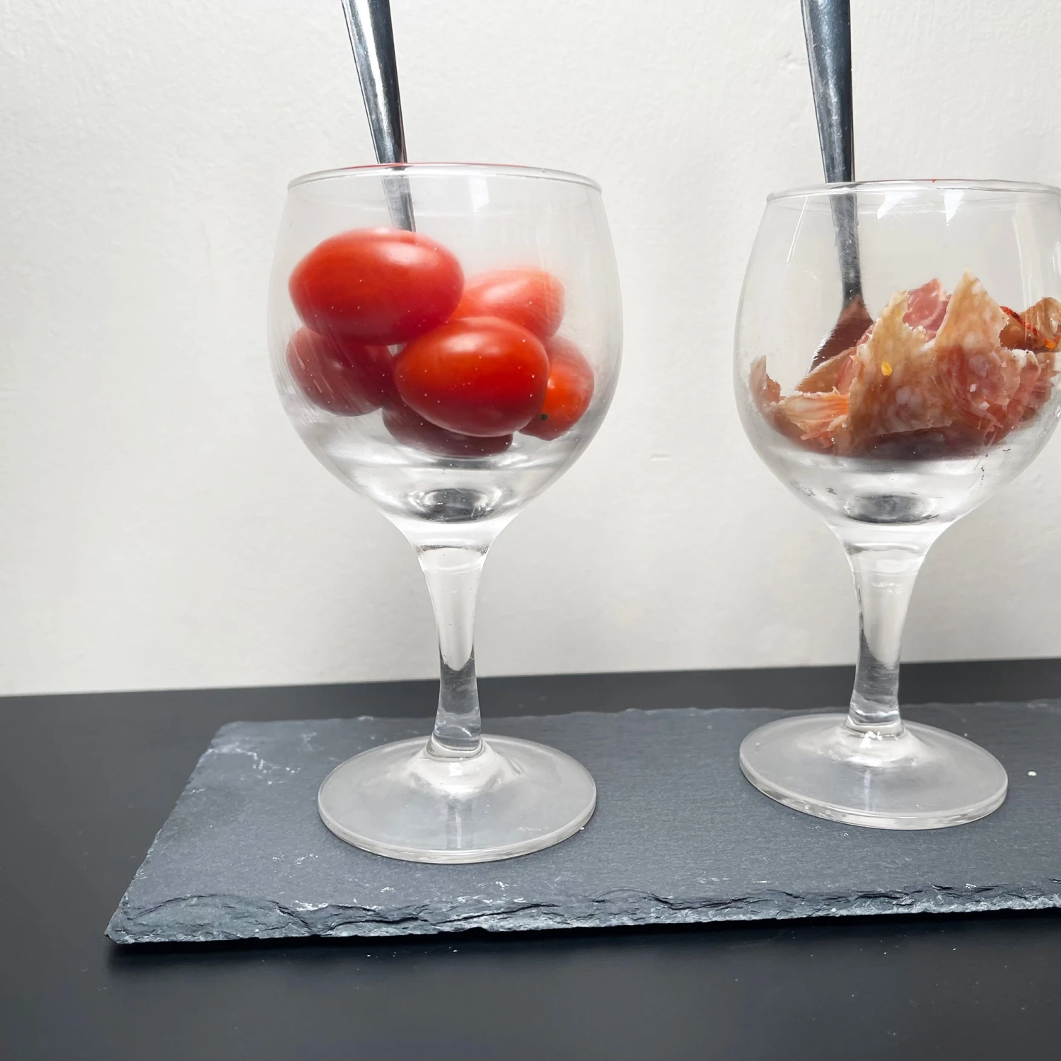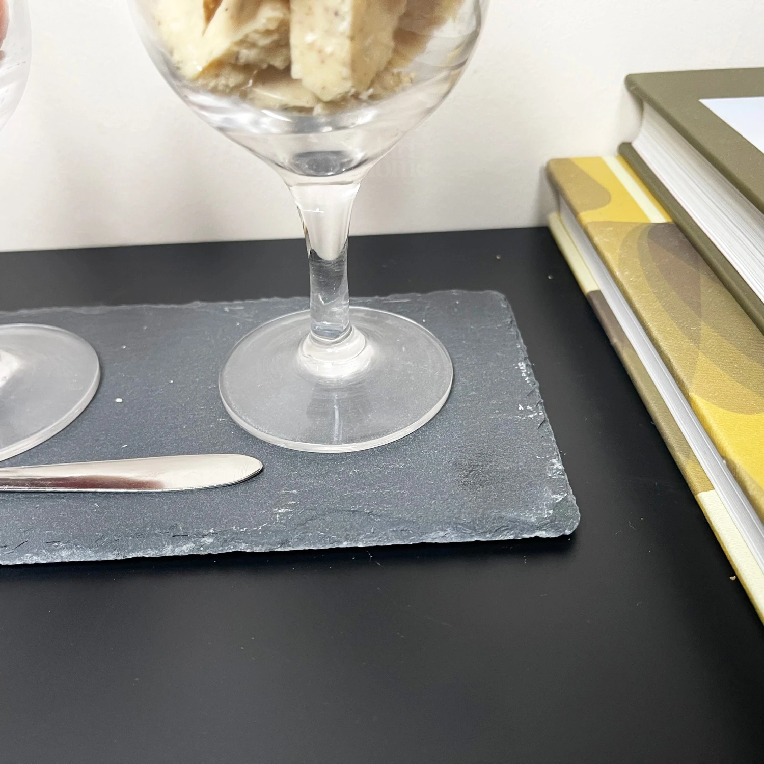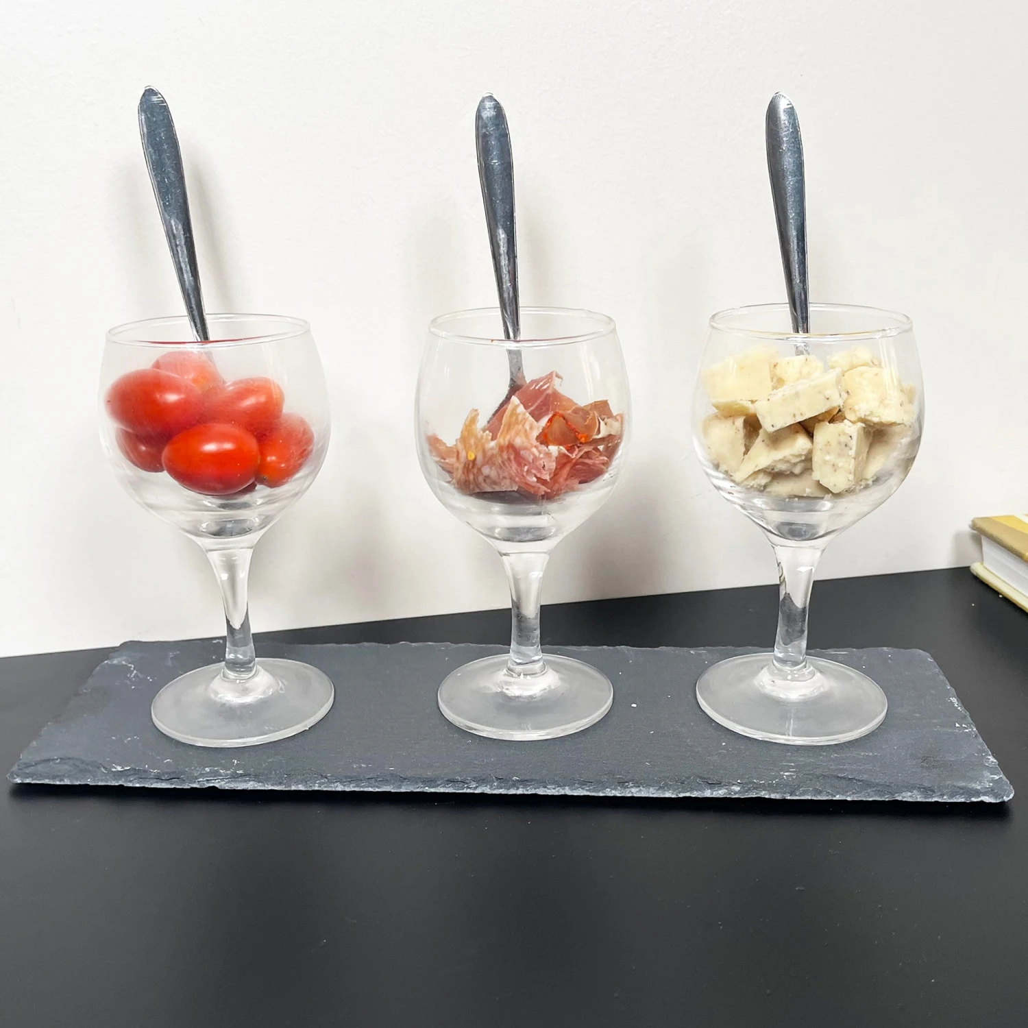 A 7pc tapas serving set including a slate serving tray, 3 stainless steel spoons and 3 stemmed tapas bowls. The perfect serving set for your home and kitchen suitable for 2/3 people.