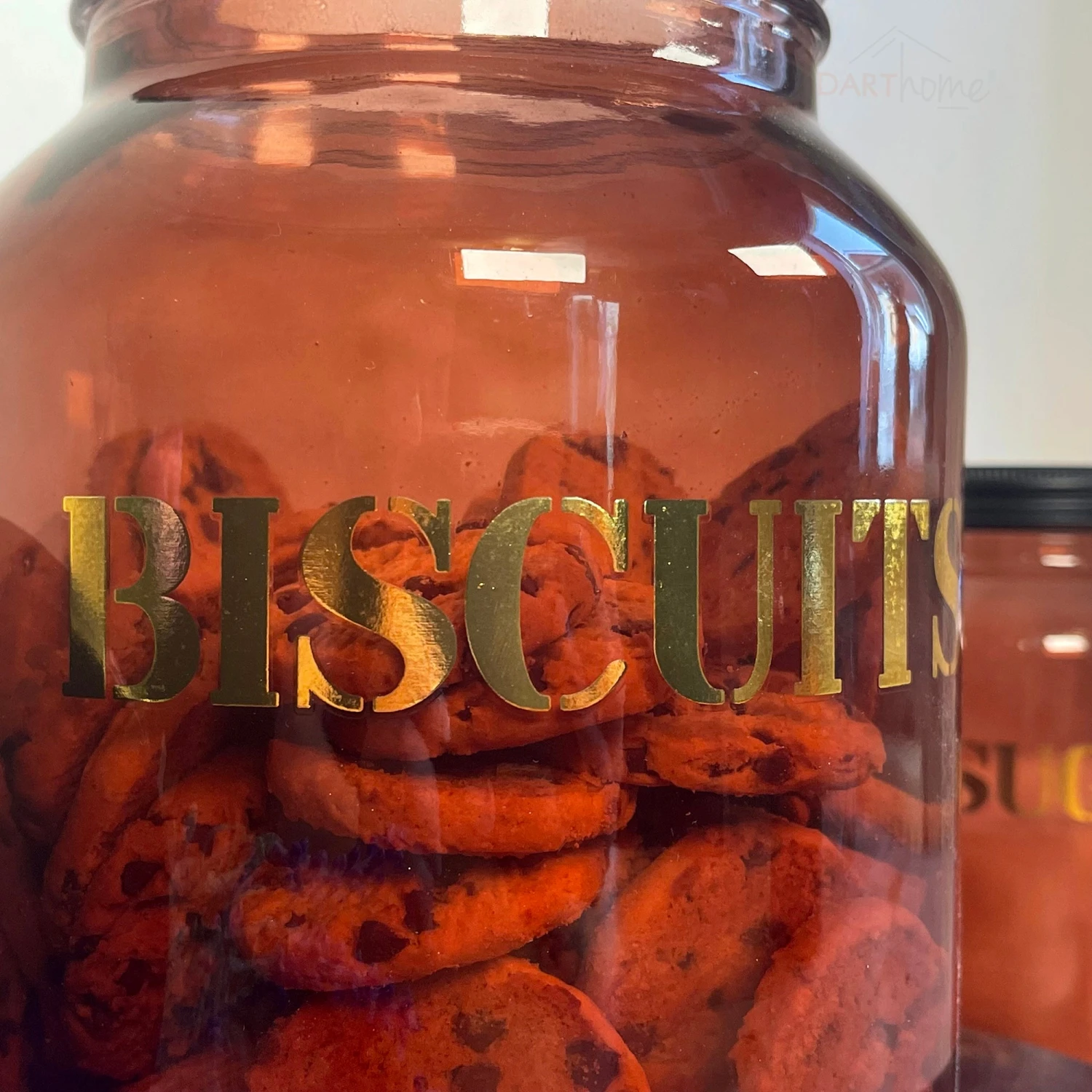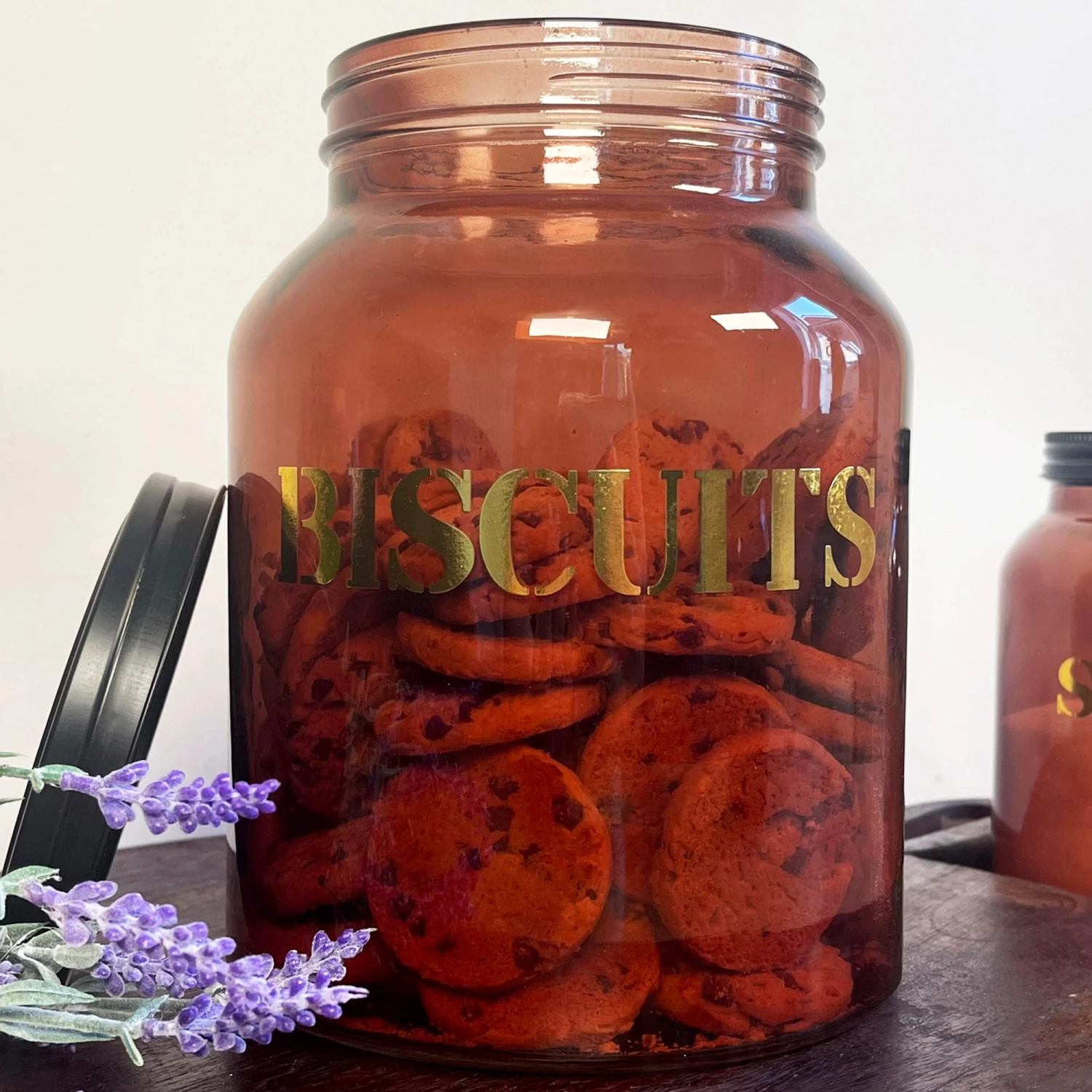In a beautiful vintage retro 70s style, this stunning amber coloured glass designed to hold over 2kg biscuit is a piece that needs to be styled in your kitchen immediately. Comes with a black metal top secure lid and gold lettering on the front spelling ‘BISCUIT’. This is a round storage jar that your kitchen decor has to have.
