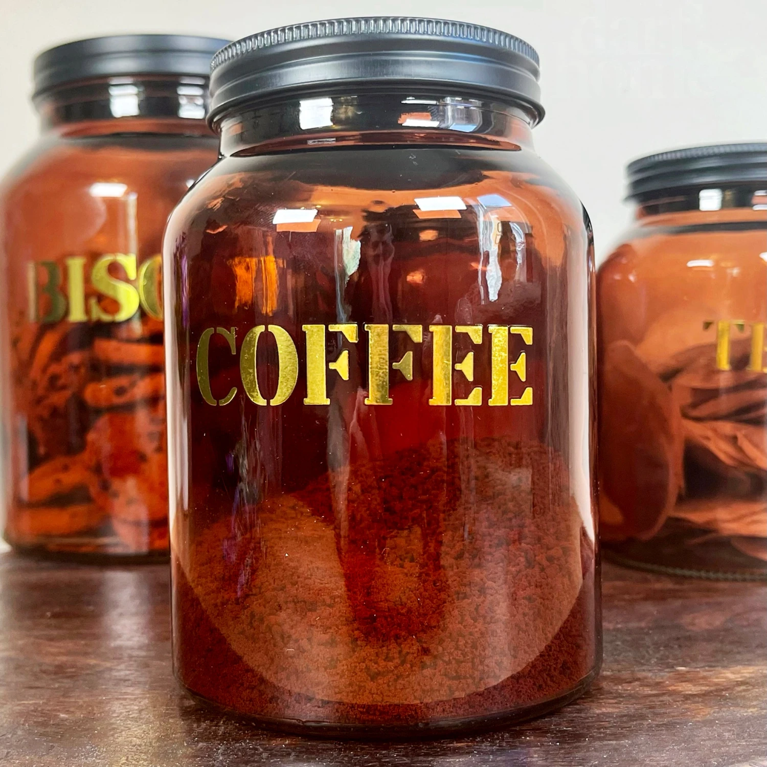 In a beautiful vintage retro 70s style, this set of 3 amber coloured glass jars designed to hold your tea bags, coffee and sugar is a piece that needs to be styled in your kitchen immediately. Comes with a black metal top secure lid and gold lettering on the front of each jar reading ‘TEA, COFFEE, SUGAR’. These are round storage jars that your kitchen decor has to have.