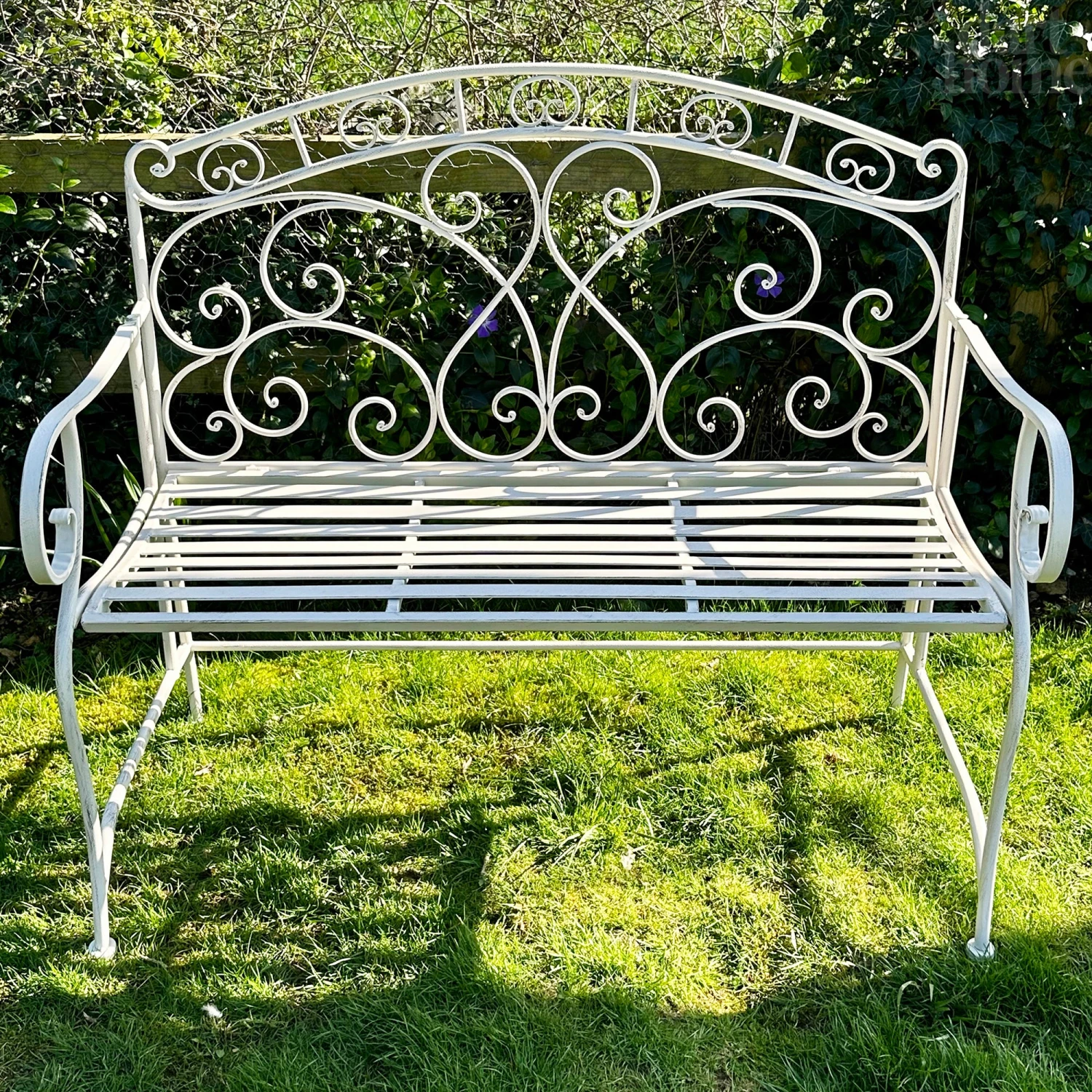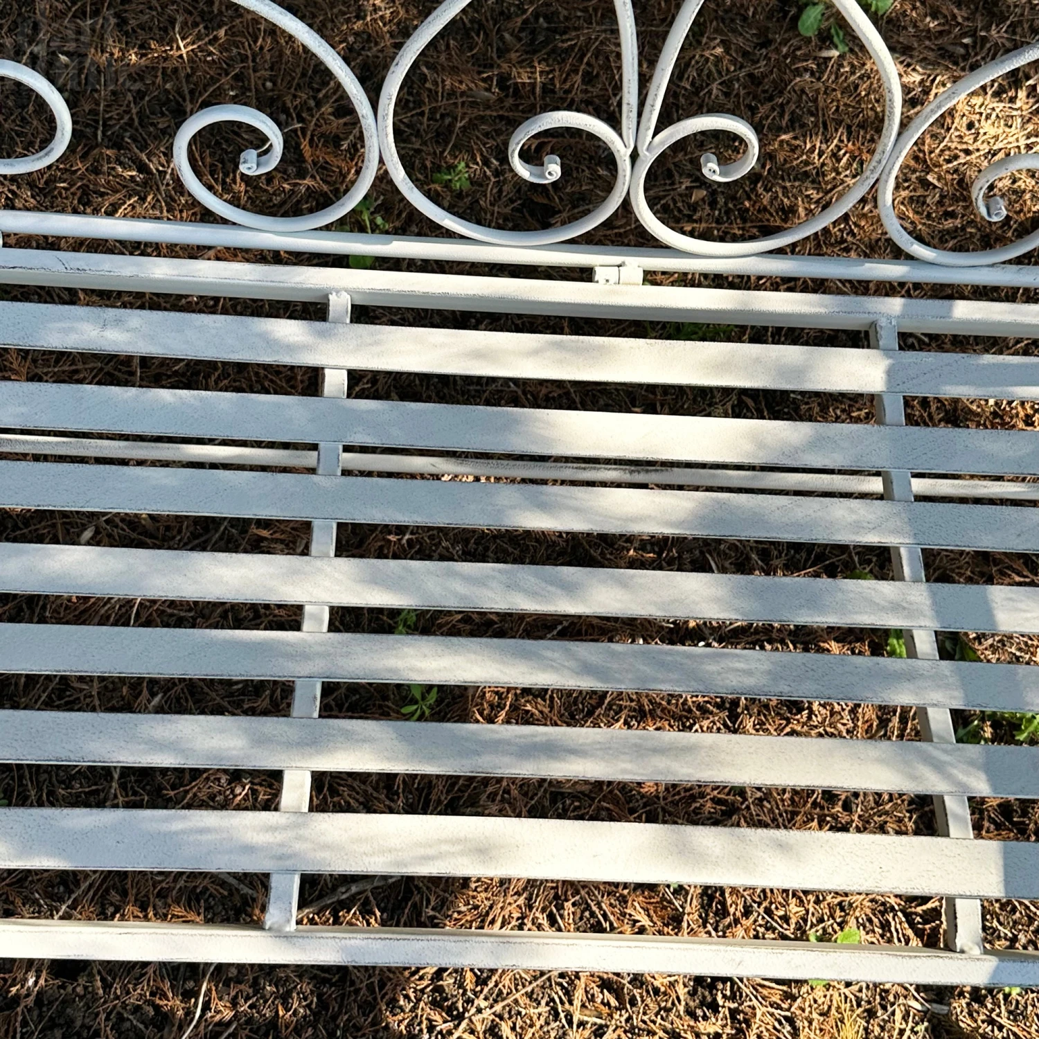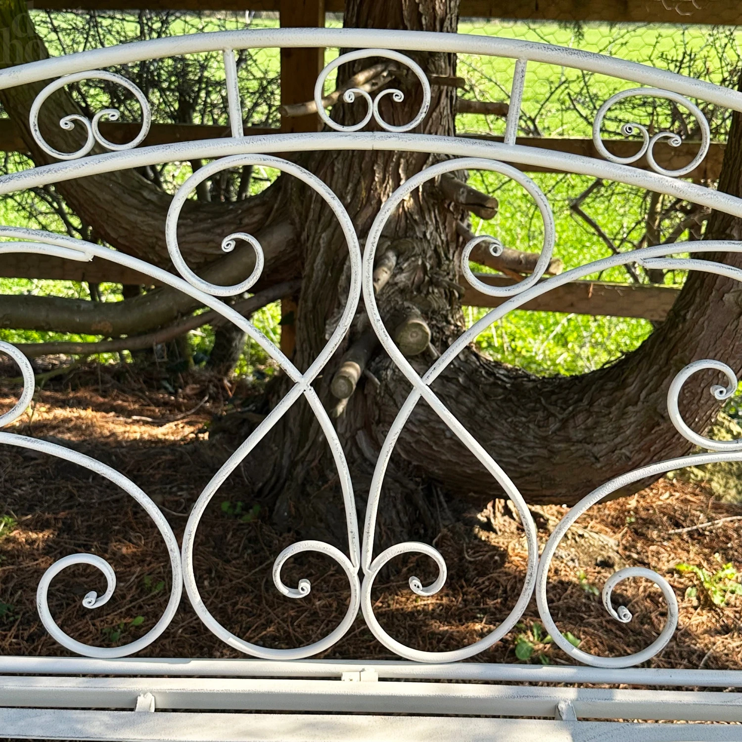 A classy antique addition to your garden. This metal garden bench features an ornate pattern throughout that will add an elegant touch wherever placed. This 2 seater bench features a distressed white finish and is suitable for year-round outdoor decoration. Arrives Collapses, simply fold out and use with no tools required.