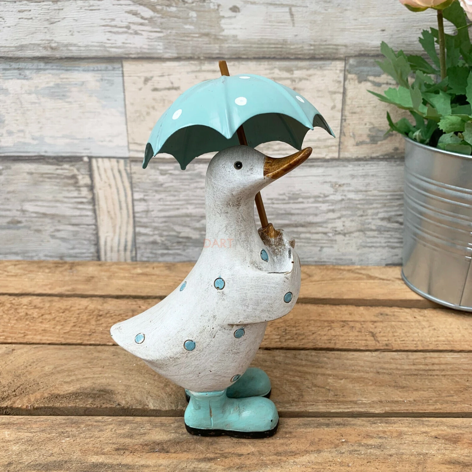 These beautiful resin duck figurines have been painted with aqua blue and white polka dots as well as being equipped with a polka dot round brolly and work as a perfect shelf sitter, looking great where ever they are placed!