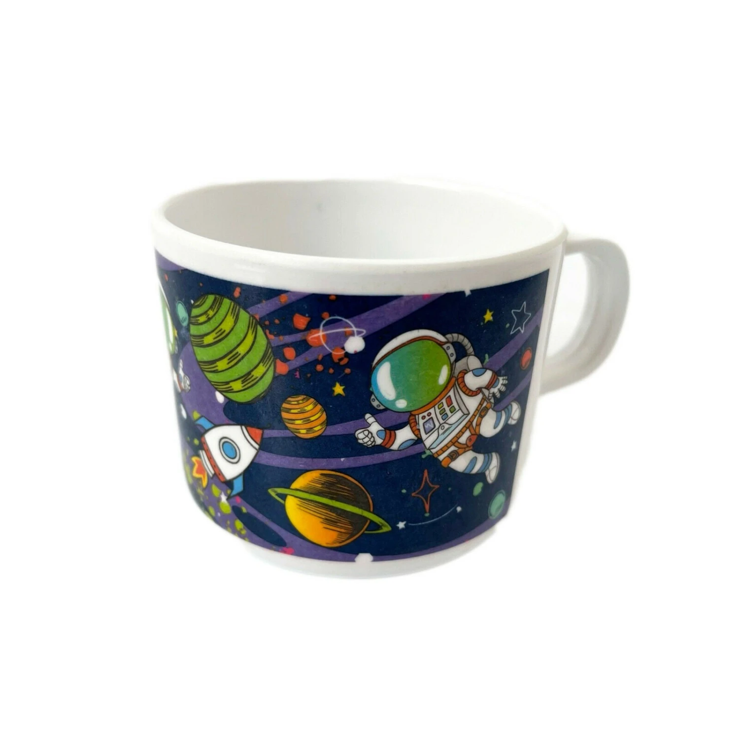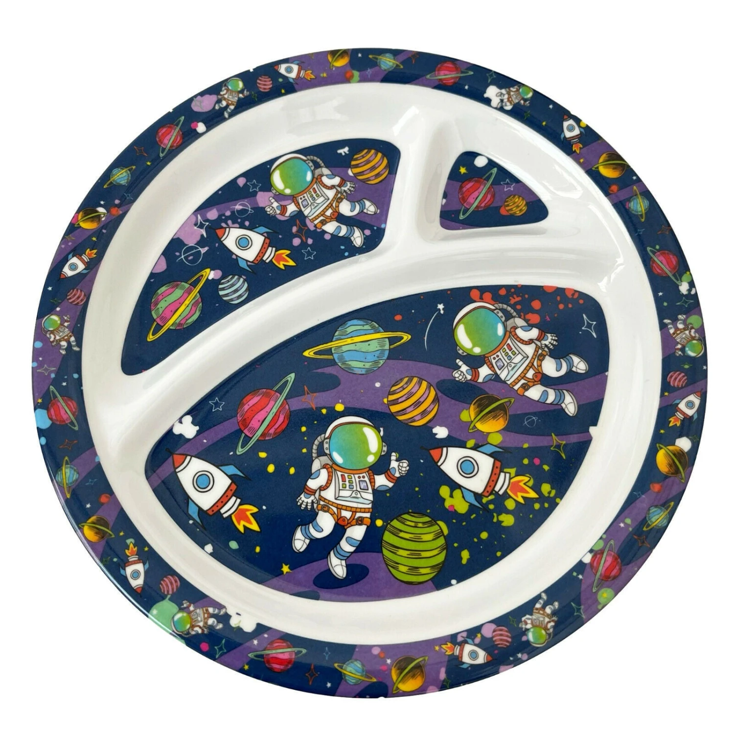 - Features: Easy Clean, Spaceman Theme, Square Frame Round Bowl, Knife & Spoon, Square Plate, 2 Sections, Round Cup