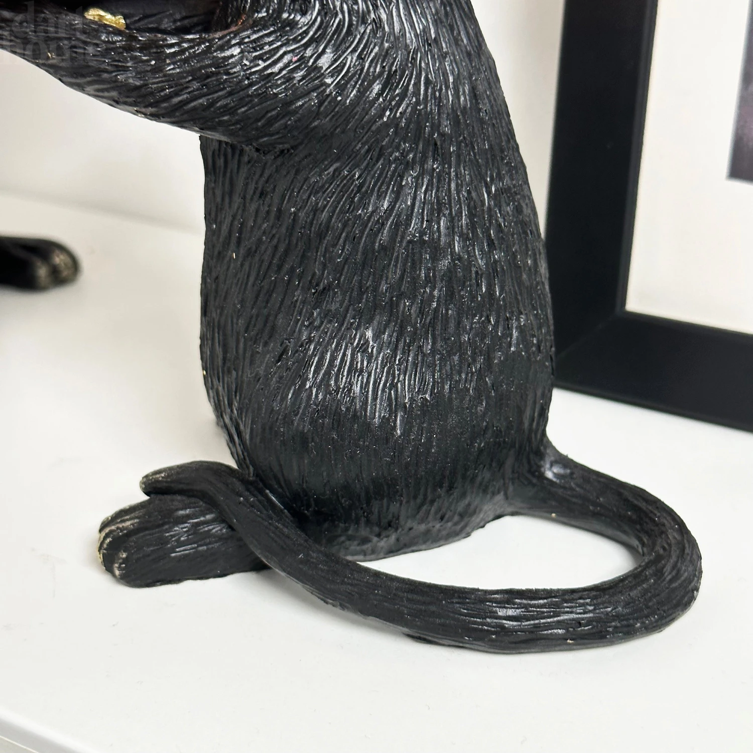 A cute pair of black mice holding tea lights, snuggly placed in a gold plate candle holder. Decorate this charismatic pair on a mantlepiece or the dining table to add a warm ambience into your evenings.