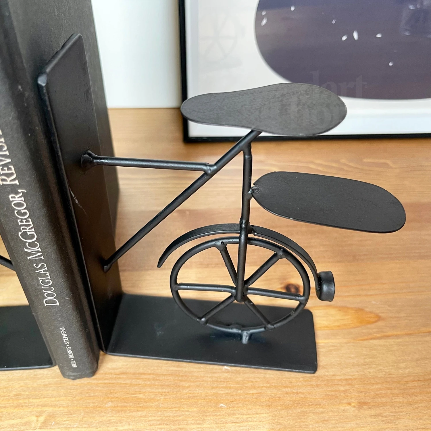 A wonderful monochrome set of bookends, split into 2 parts in the design of a bicycle, stood up sturdy retangular bases. Finished in matt black, these bike bookends are perfect for a bike riding enthusiast, acting as perfect shelf sitters to keep all your favourite books organised.