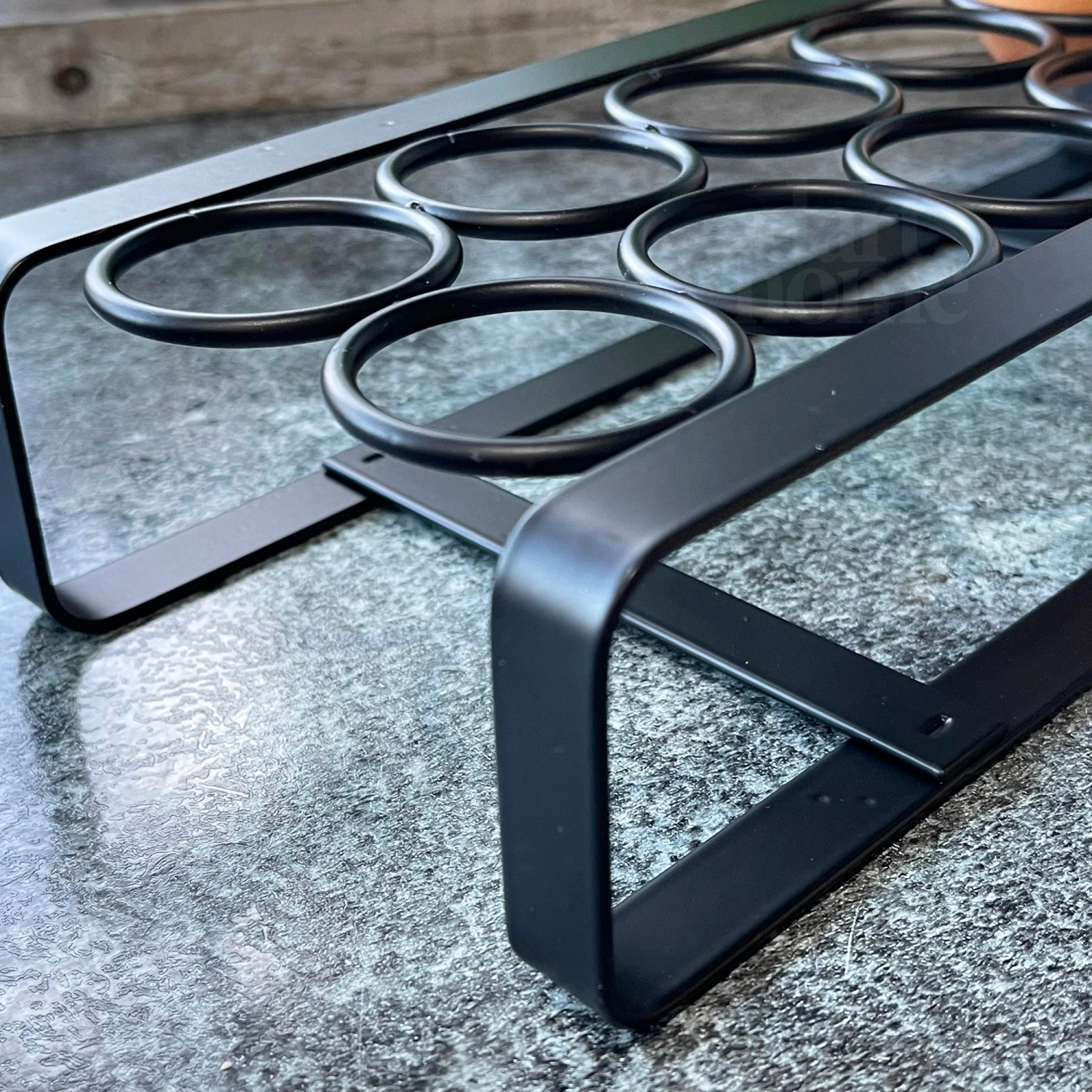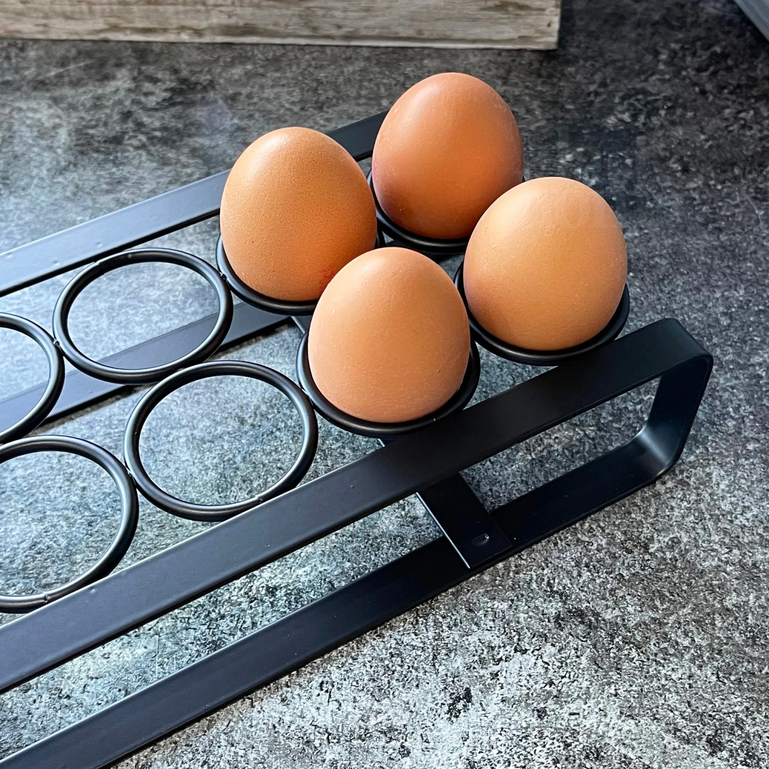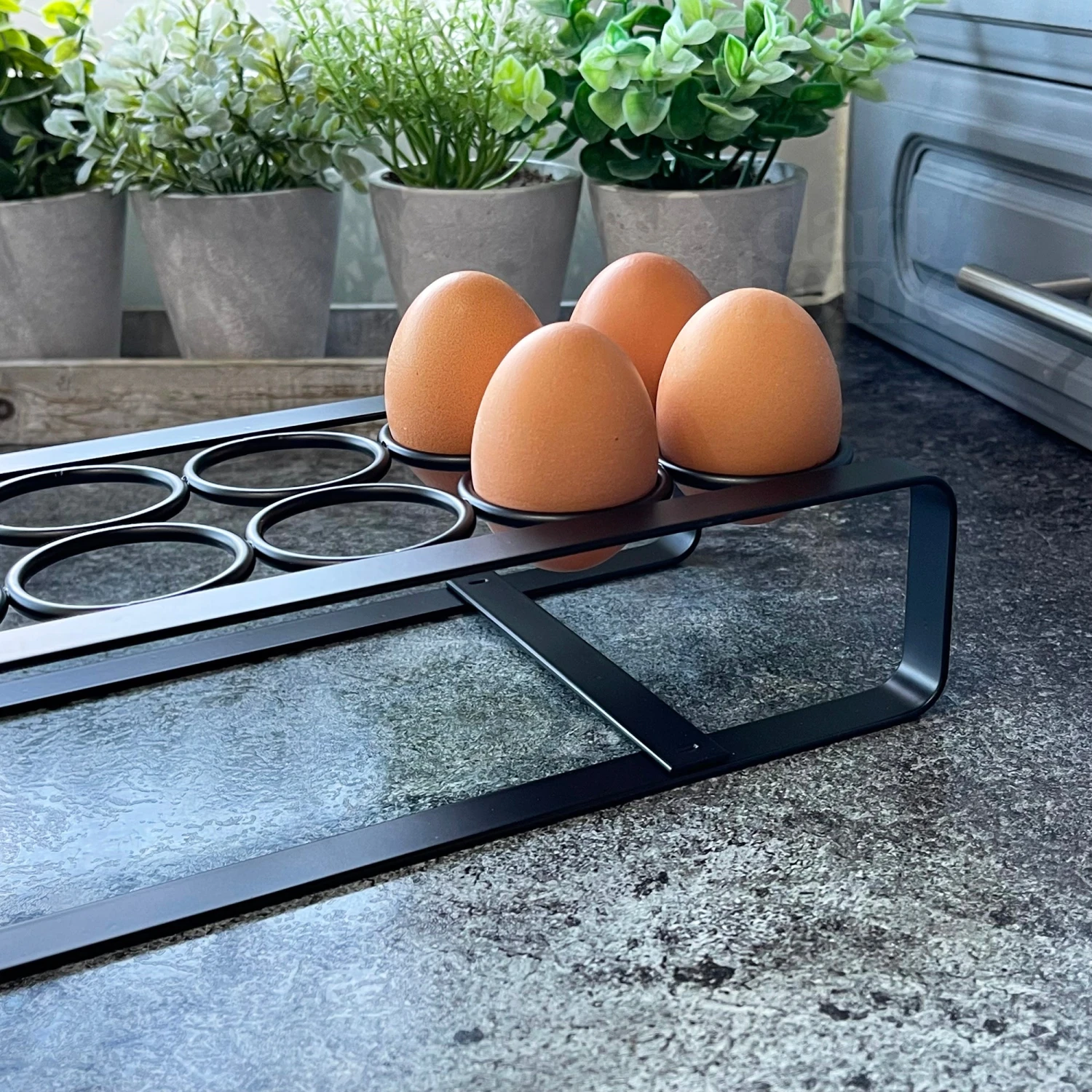 Classic monochrome style egg holder that would look great in a modern neutral kitchen. This egg holder is made from iron metal and with a metallic black finish. 12 egg capacity.