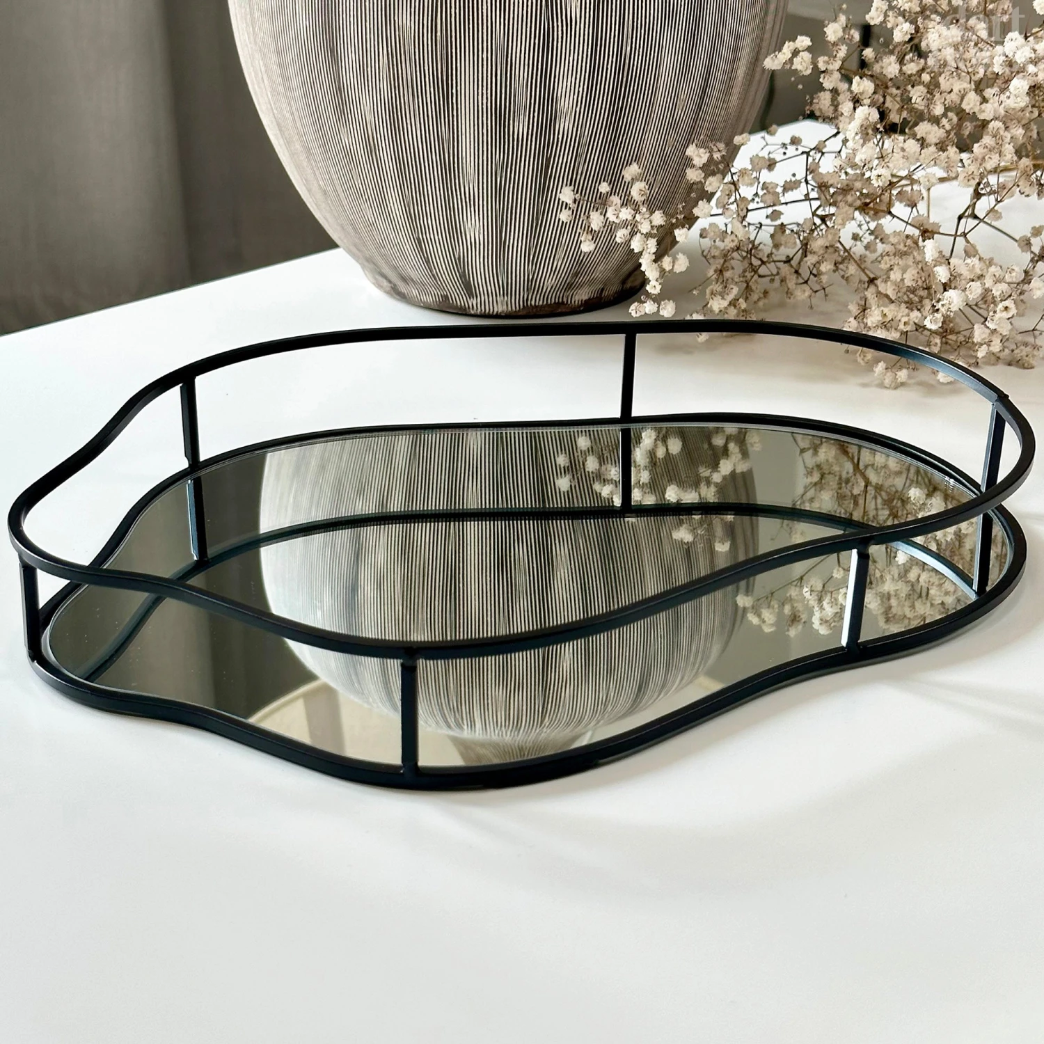 This stunning black pebble mirror tray exudes timeless elegance and sophistication. Its abstract modern design, metal frame, and decorative glass comes together to create a distinct and exclusive piece that will add a touch of luxury to any home. Style A.