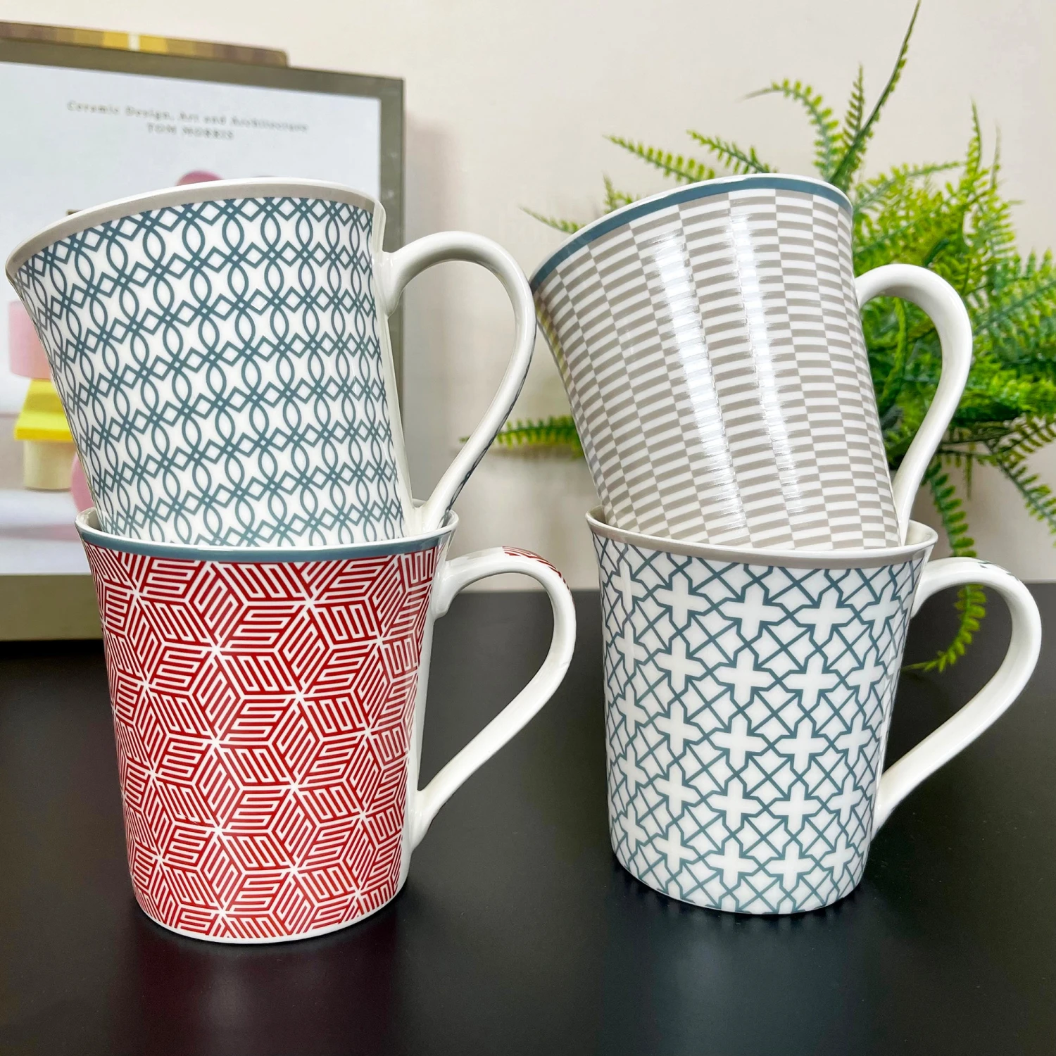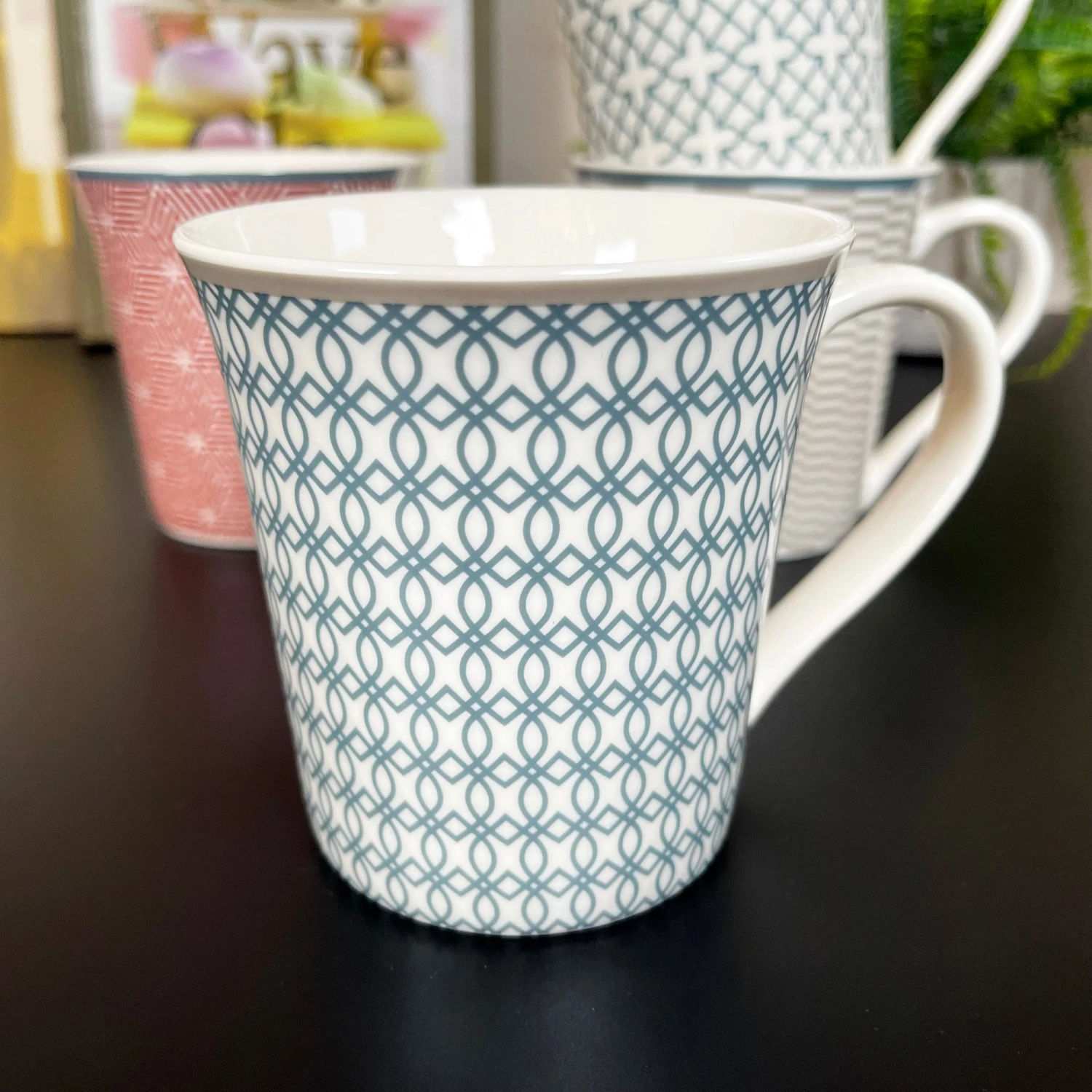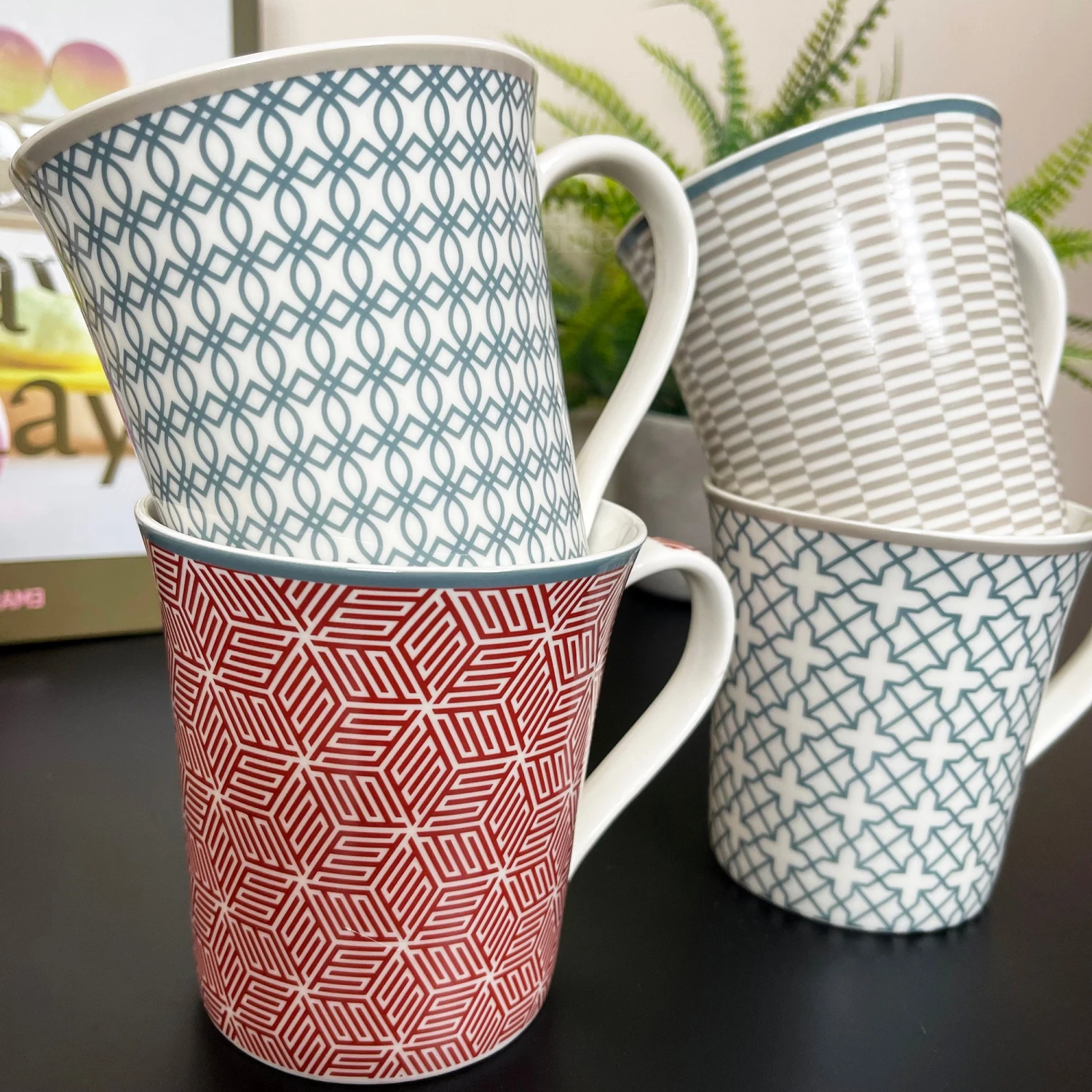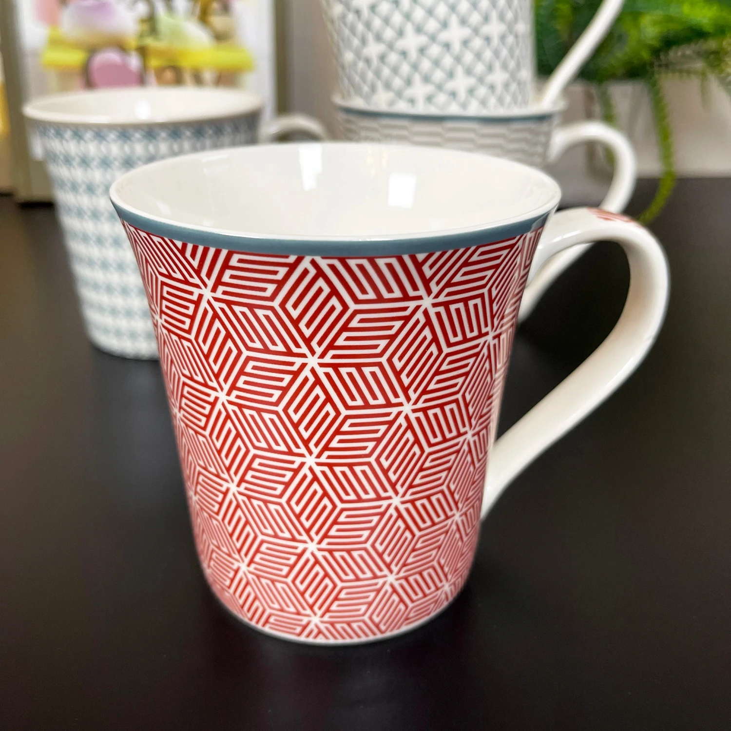 A brilliantly quirky assortment of round mugs, covered with a variety of geometric patterns displayed in blues, reds and greys with a white contrasting base colour.