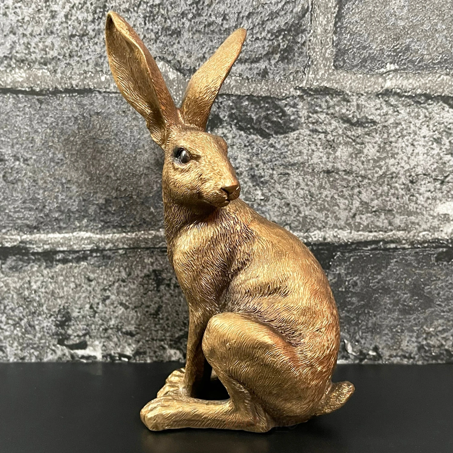 Sitting march hare ornament designed for indoor home use to add some character to your home decor. Made from resin with a textured bronze effect finish. Will be a feature point of any room.