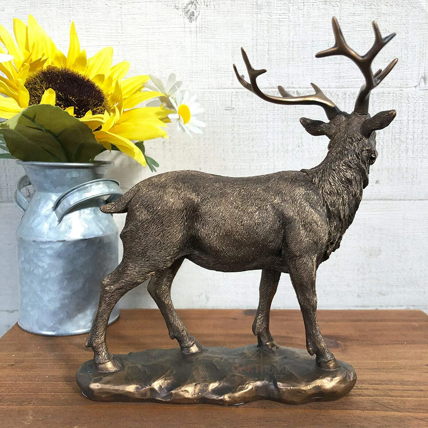 Crafted from bronze effect resin, this high quality detailed handcrafted stag standing sculpture will work as a perfect shelf sitter in your home. It is designed for indoor use.