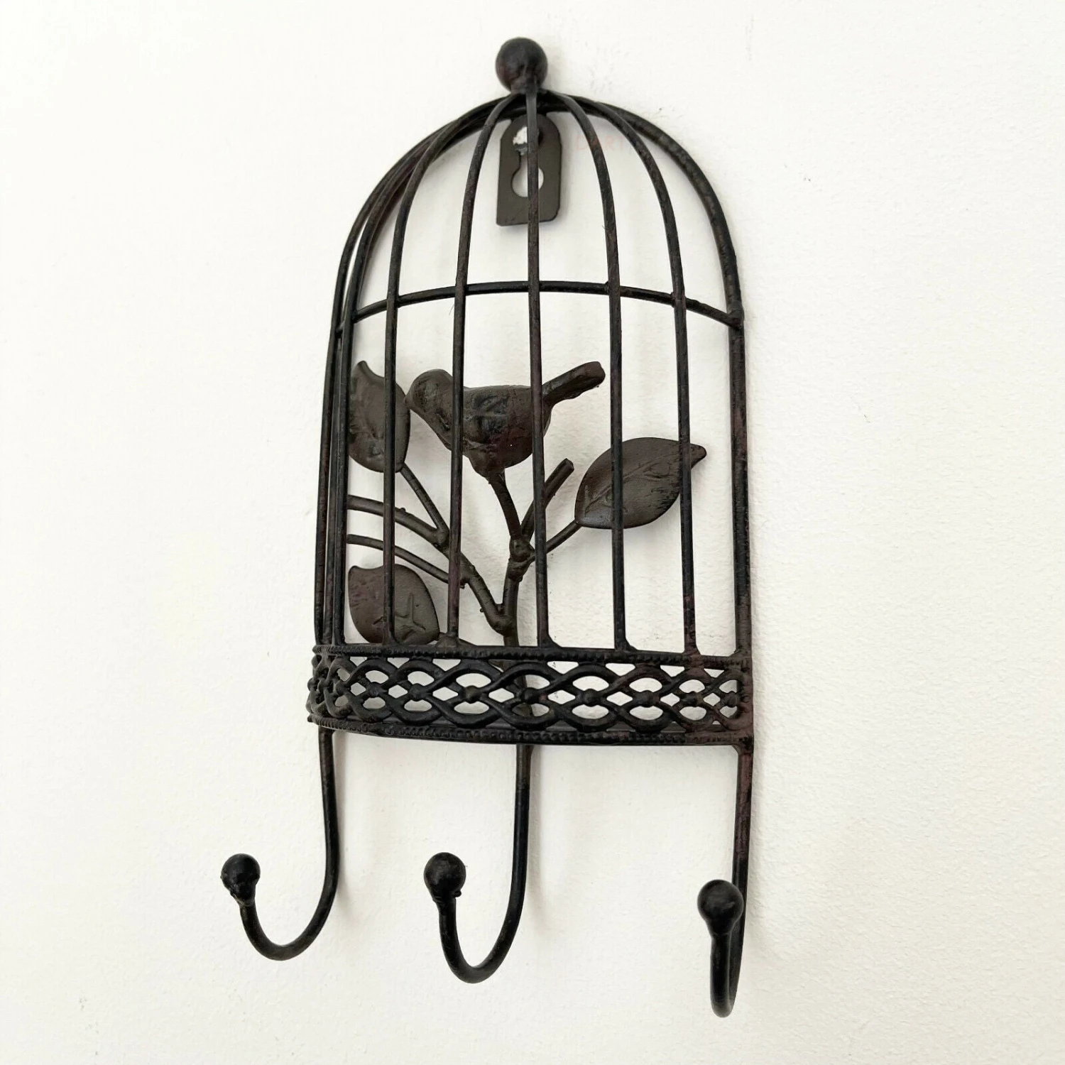 Vintage, rustic style triple coat hooks in a bird cage design. This clothes rack is made from cast iron. 3x Wall hooks included, perfect for coats, jackets, hats and keys.