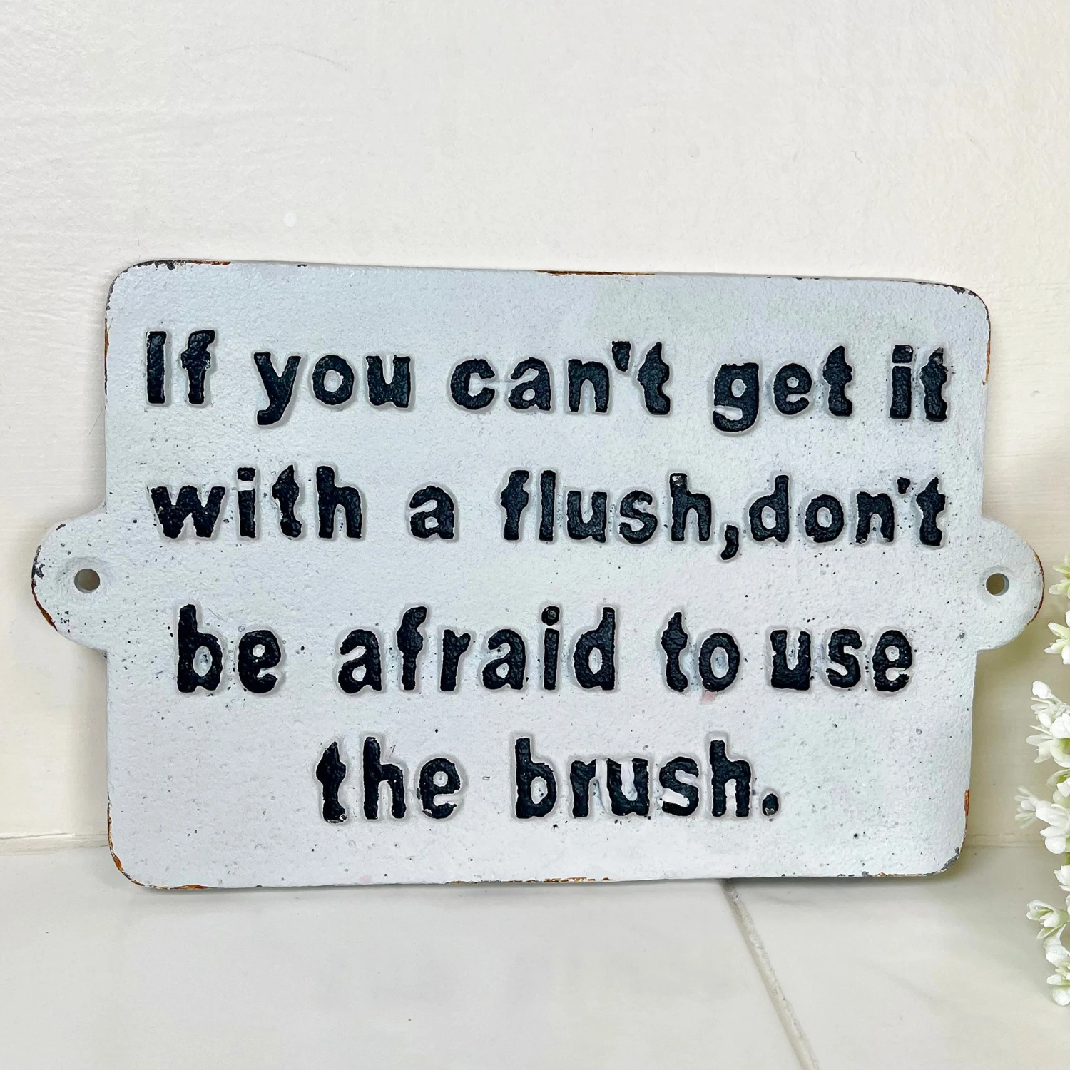 This wall mounted sign has a distressed vintage white finish. It is made from high quality cast iron, designed for indoor or outdoor use. The text reads ‘If you can’t get it with a flush, don’t be afraid to use the brush’. It will look great in your toilet or restroom.