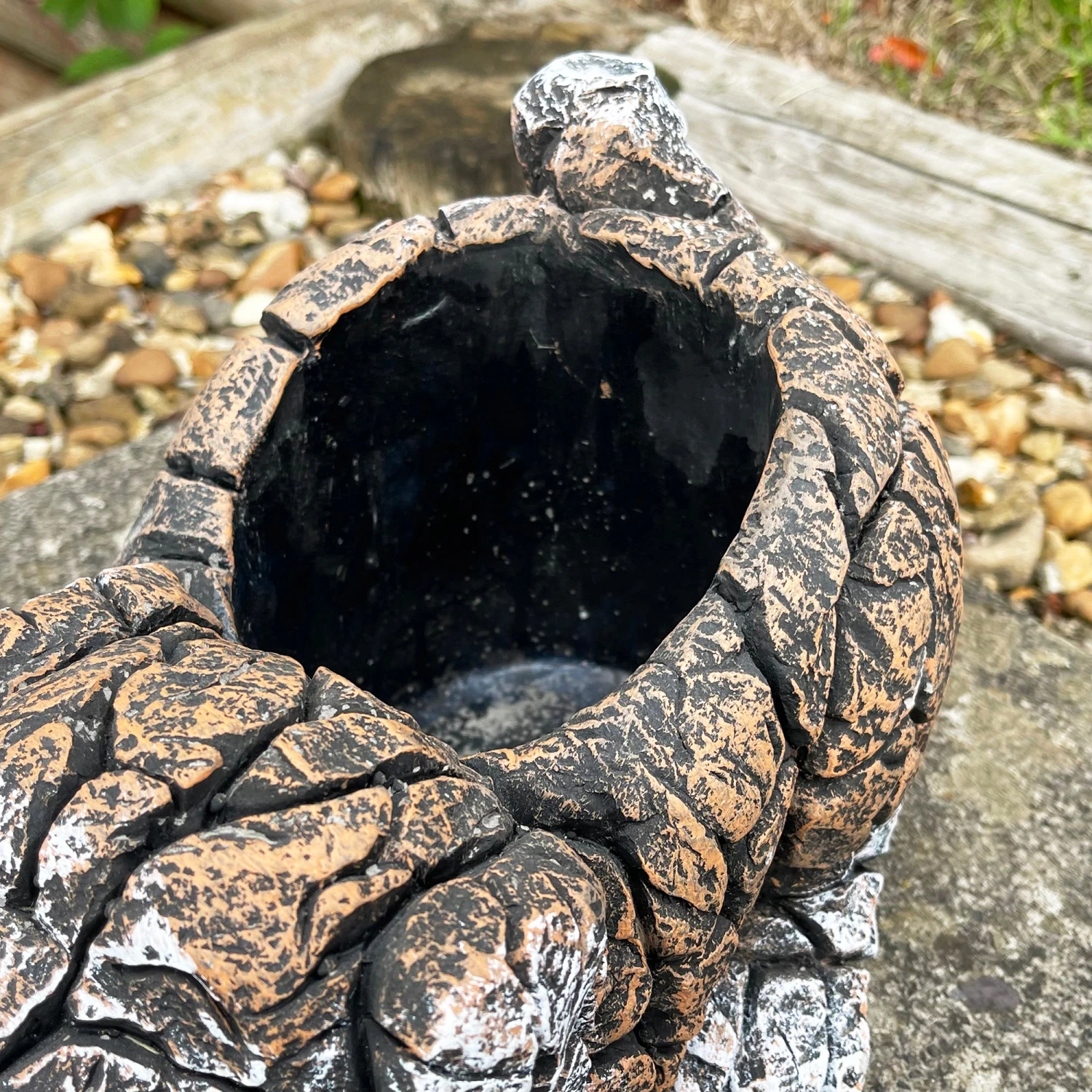 This cement plant pot is an outdoor heavy duty piece. It comes in a wood chunk effect sitting puppy / animal design. It is an excellently detailed flower pot. Planter comes with a drainage hole with optional plug making it useable indoors and outdoors.