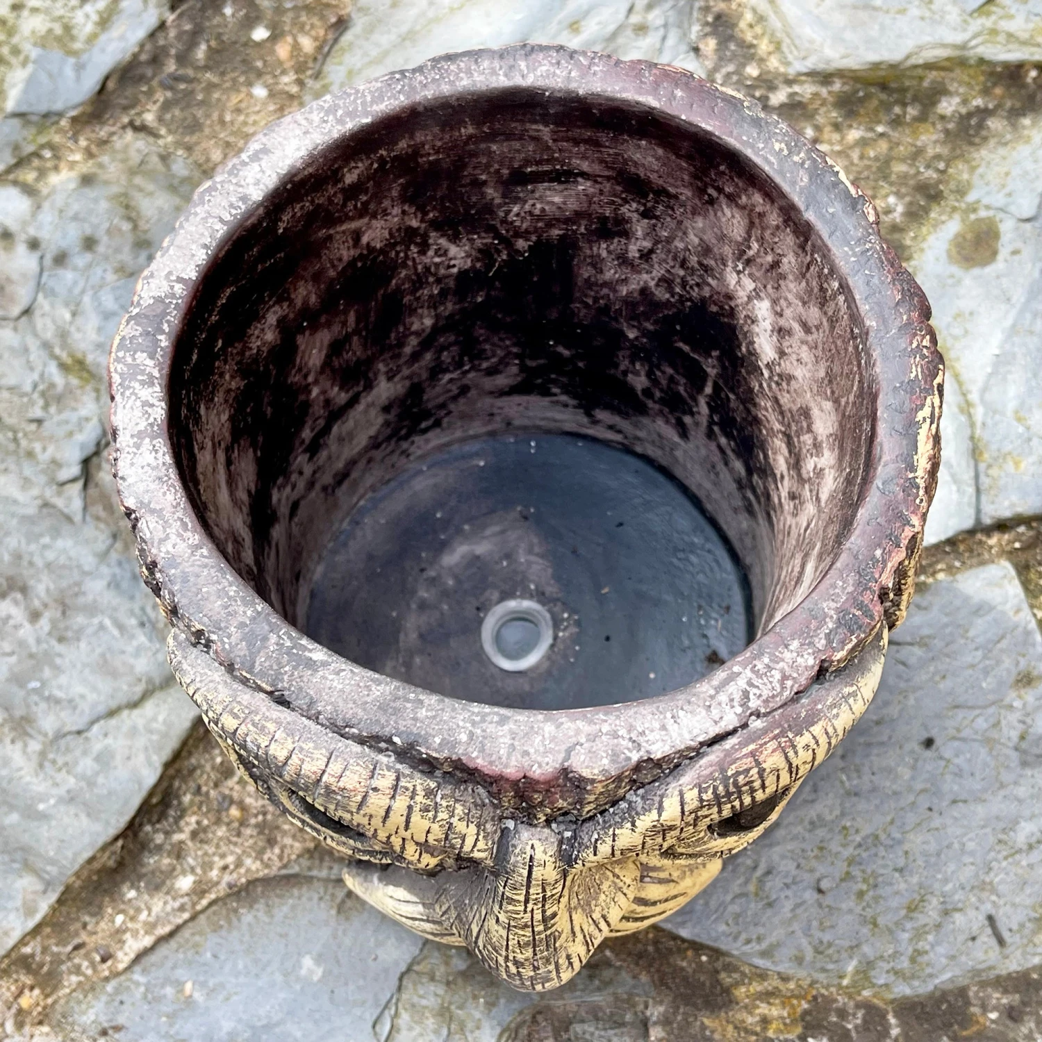 Cement brown wood effect planter with an antique design showcasing an embossed face carved onto a tree stump. Round pot with a drainage hole included suitable for outdoor purposes.