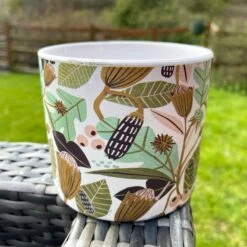 Attractive ceramic indoor plant pot coming in a plant leaves foliage design throughout the planter. Does not come with drainage holes so suitable for home use only.