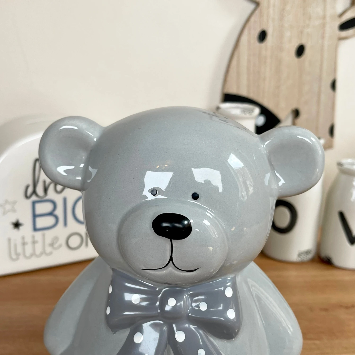 A coin moneybox perfect for keeping your little ones savings safe and sound until they need them! Made from ceramic, glazed and completed with a glossy grey finish, these cute teddy bear shaped money banks feature a bow tie and a rear coin slot. Equipped with a silicone cup on the bottom for when its time to dip into your hard work!