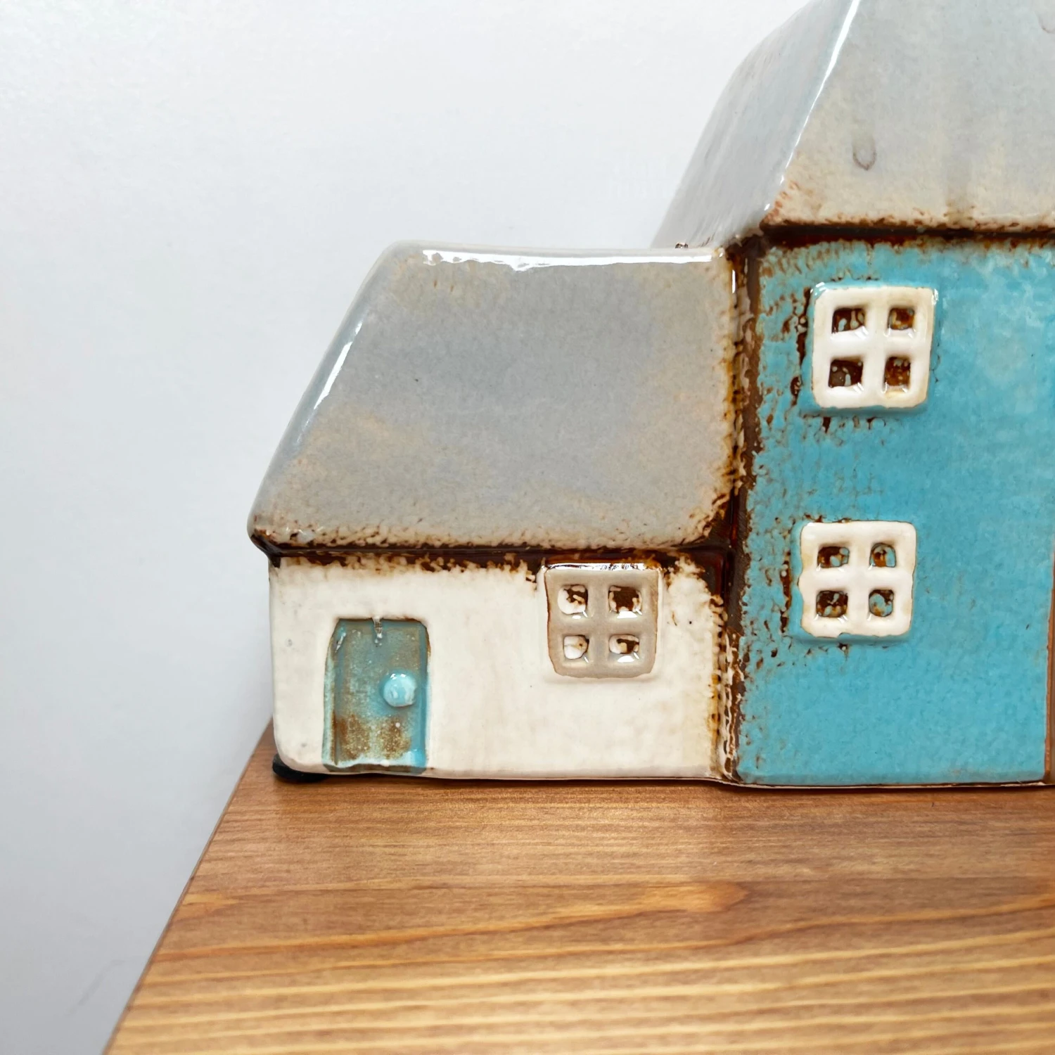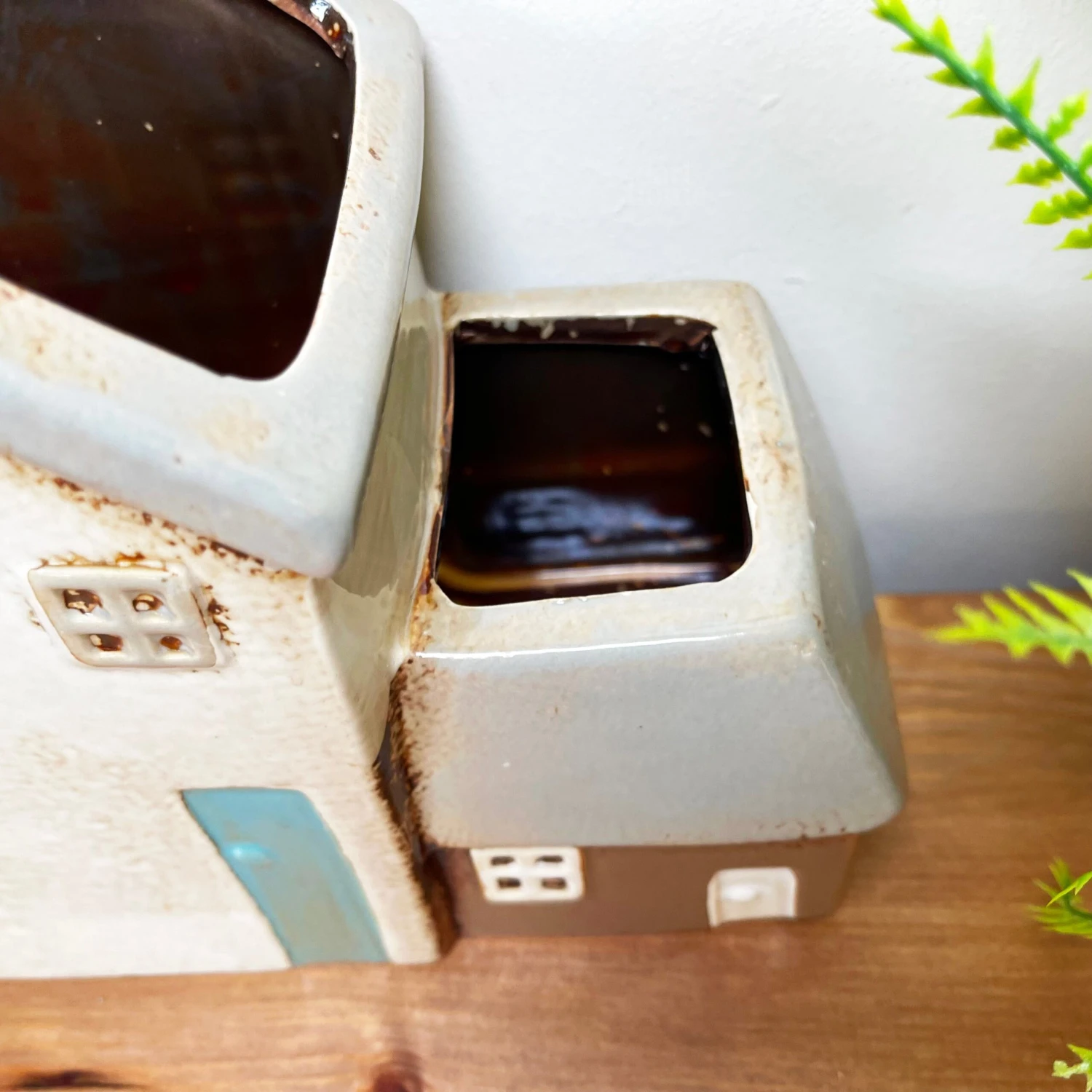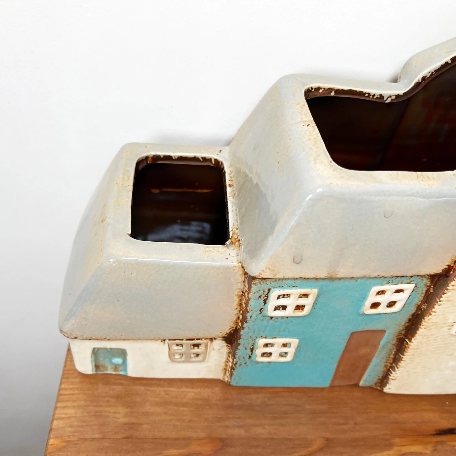 This row of ceramic village cottage houses designed to be a plant pot is delocately made and painted to perfection. It will look great in any setting.