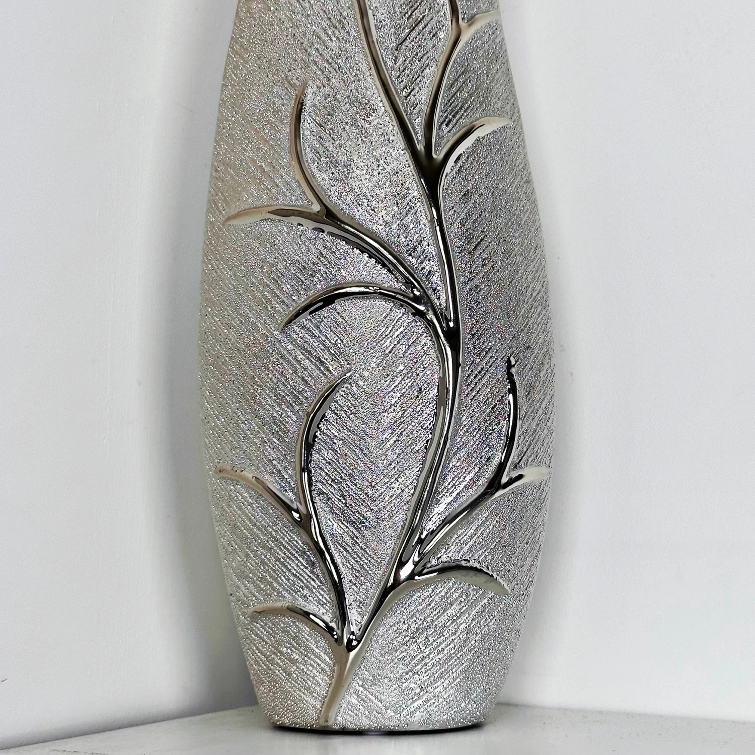 These beautiful champagne silver, ceramic slender leaf vases are perfect flower vases that will act as perfect statement pieces on any home or wedding table that is placed on.