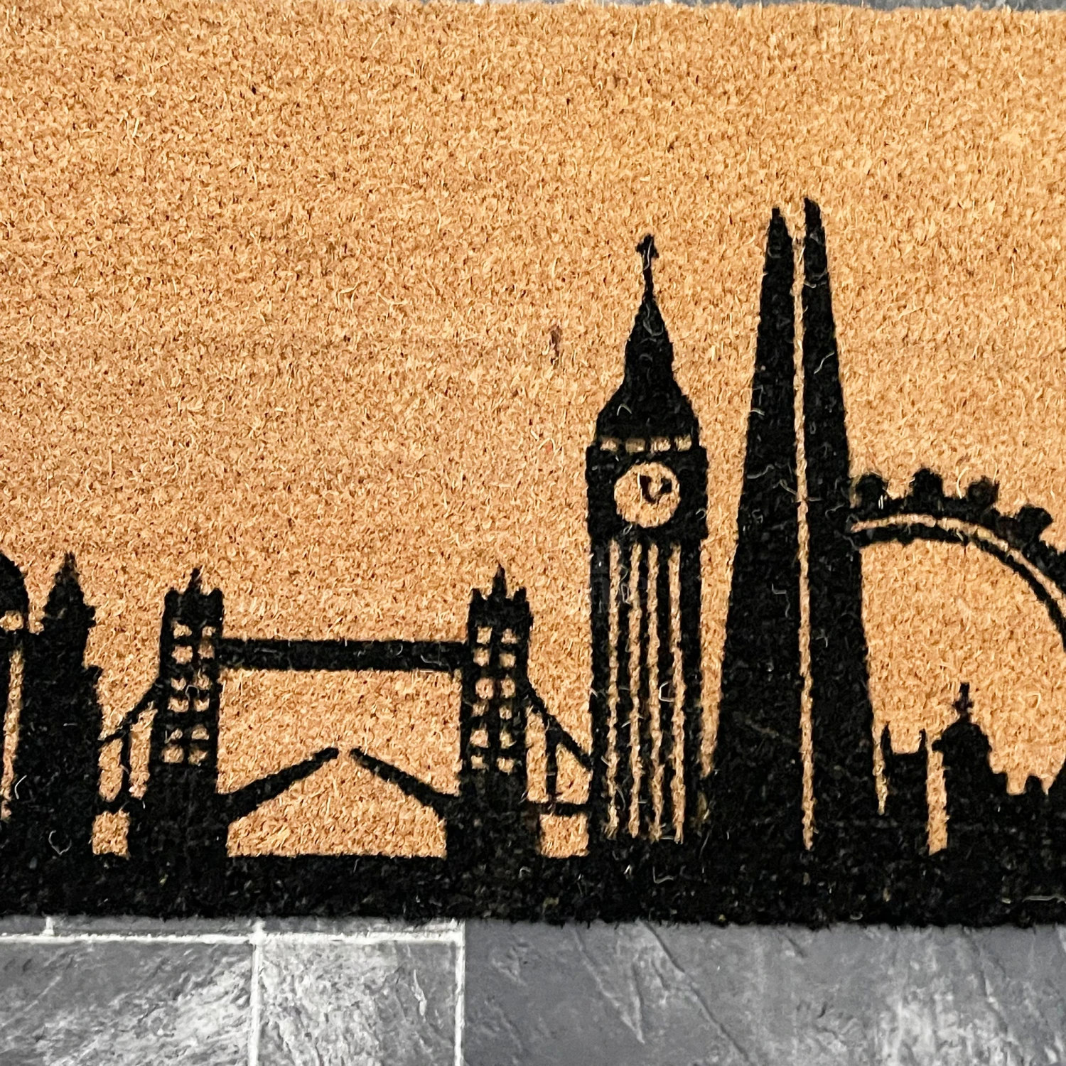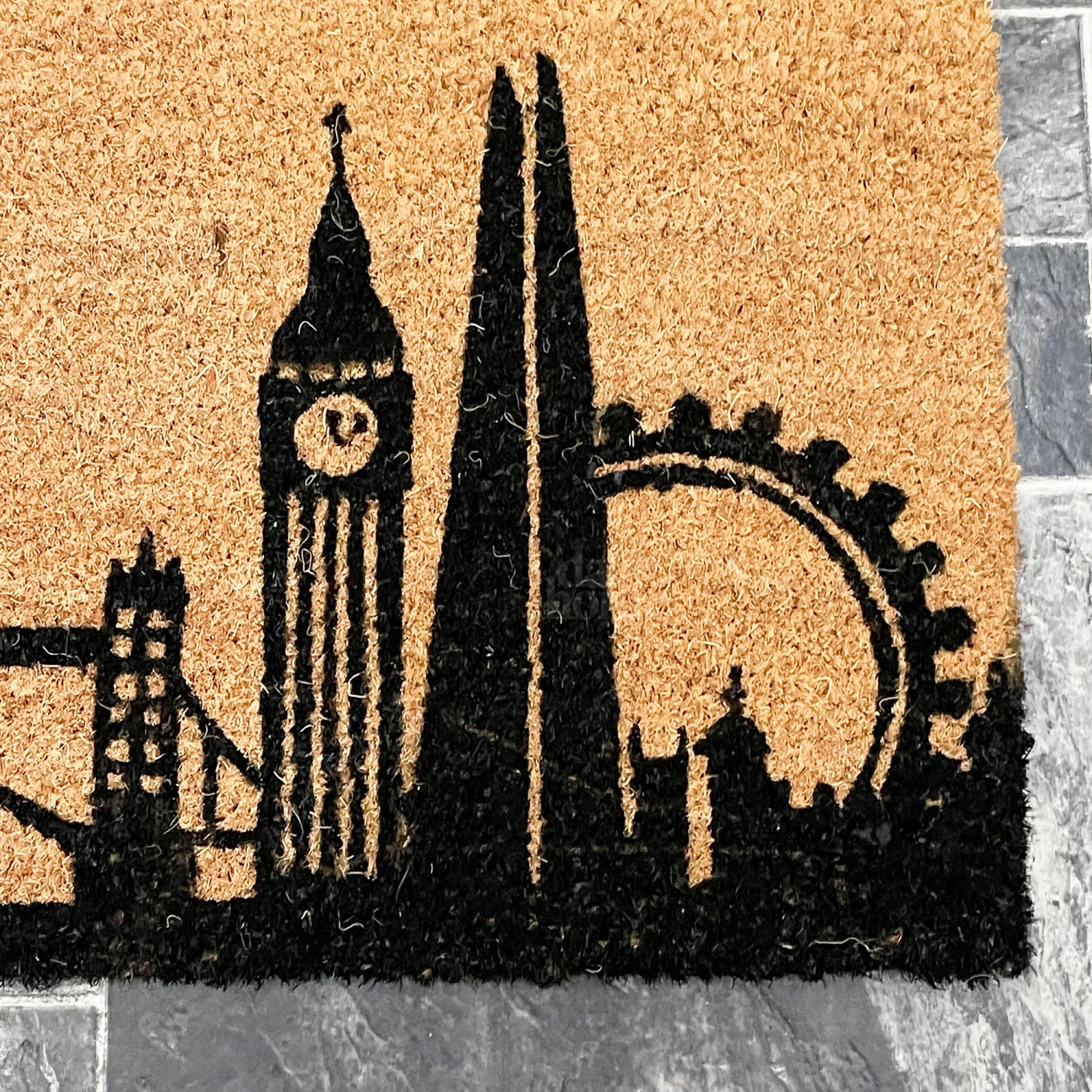 A london themed natural coir door mat featuring a silhouette design of the Famous London City Skyline. It is a year-round decorative doormat that can be placed indoor or outdoor by your door to stop the outdoor mud getting inside. This door mat is made using biodegradable coir and latex backing to prevent slipping.