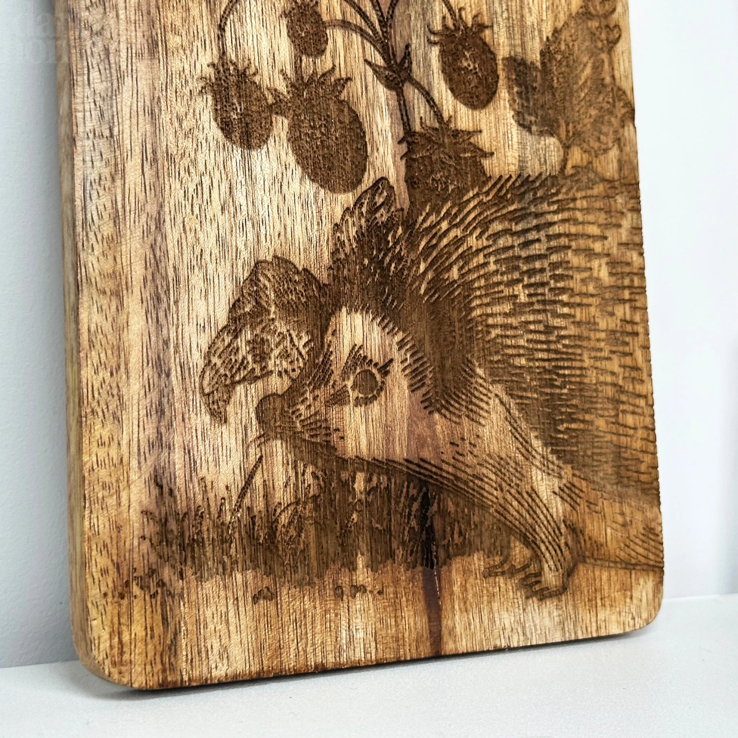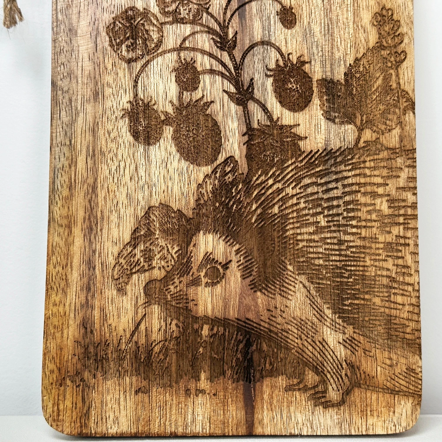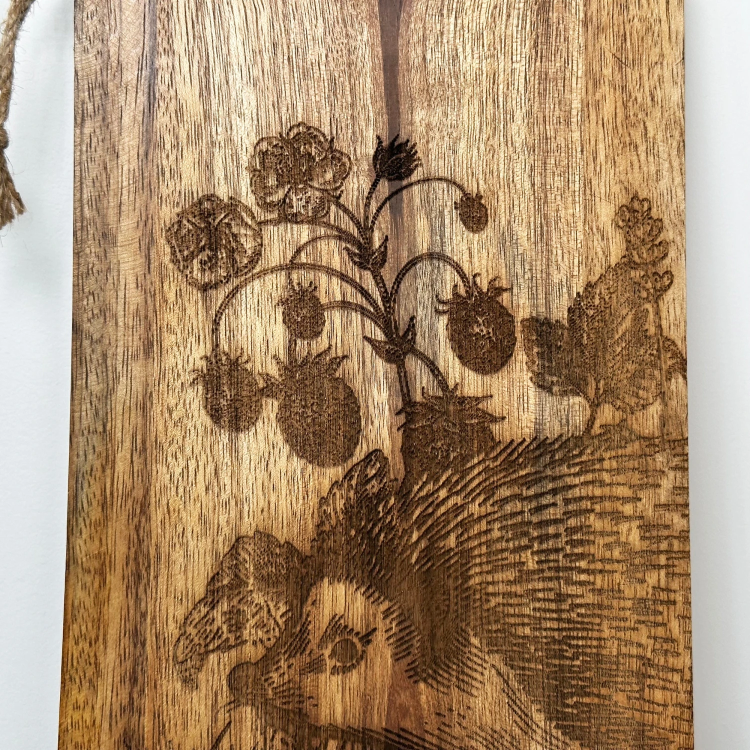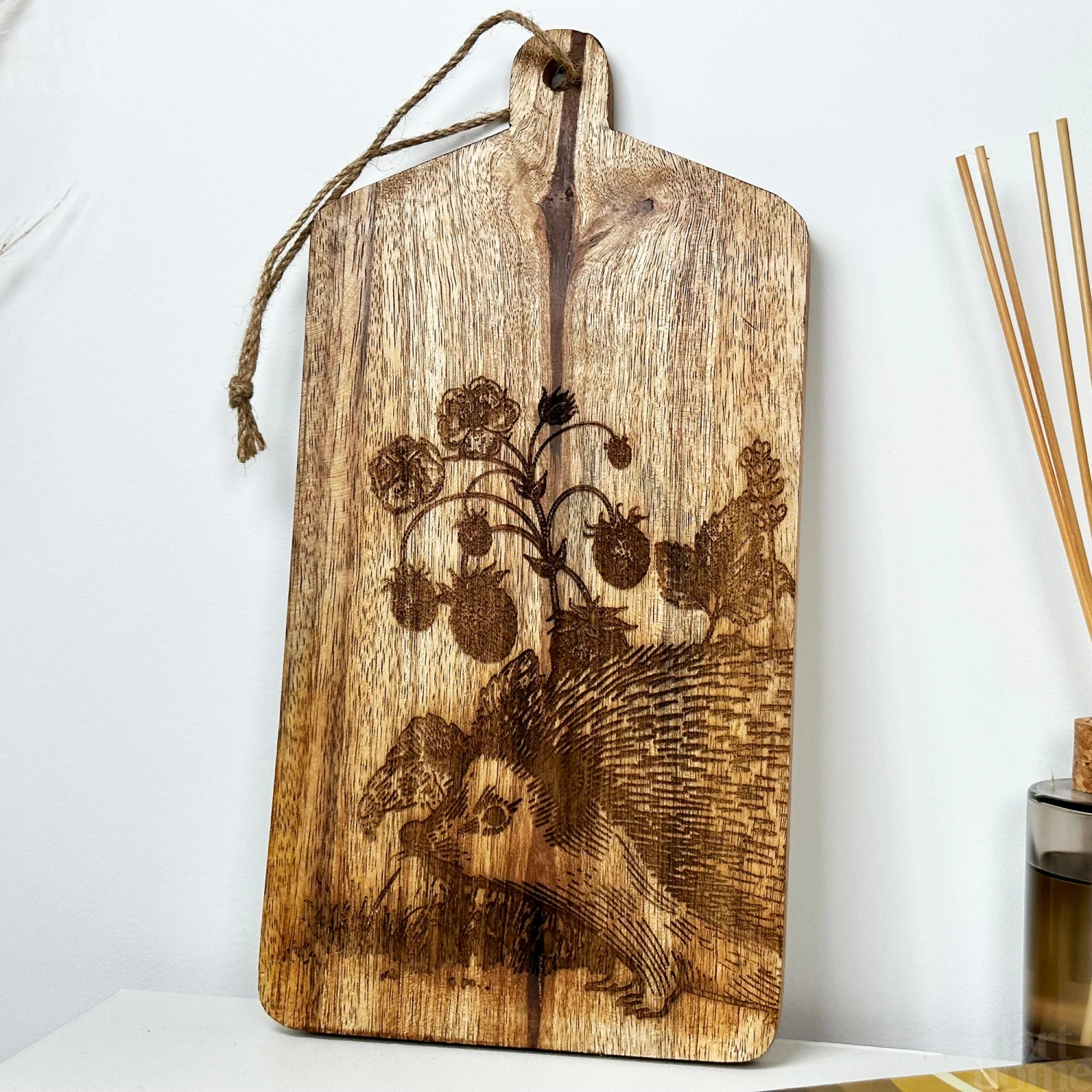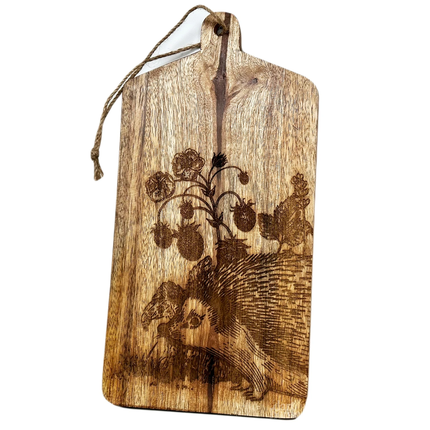 A hand burnt woodland hedgehog serving board boasts a contemporary country style woodland forest design and is made of beautiful 100% mango wood with a handle and rope hanger on one end. Try it for serving shared food such as a charcuterie or cheese course. Wipe easy clean. Hand wash only.