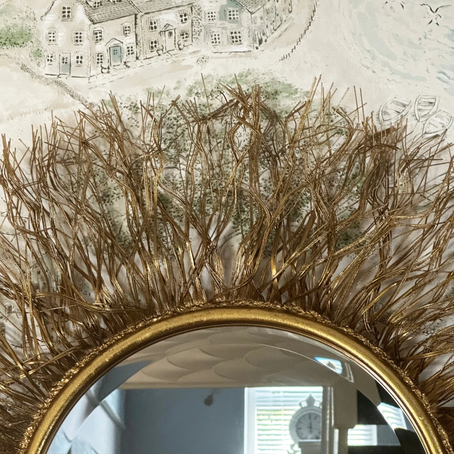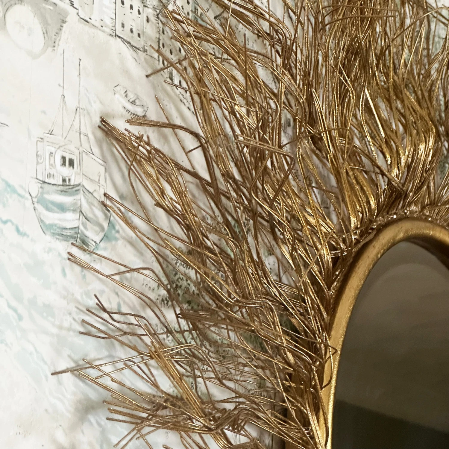 This Antique Gold Wire Sunburst Wall Mirror is the perfect accessory to add a touch of eclectic style to your modern living room. Crafted from antique gold wire and featuring a 95cm frame and round internal mirror, this wall mirror is a unique, quirky way to decorate your fireplace and add a touch of luxury to your home.