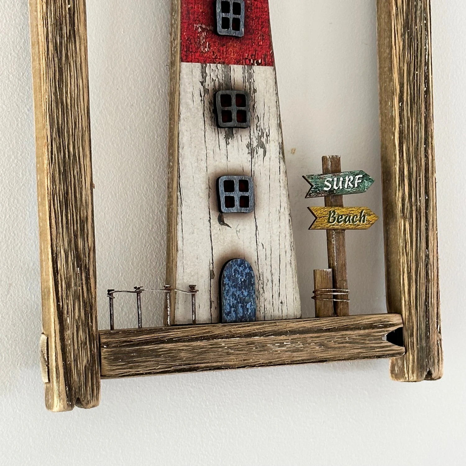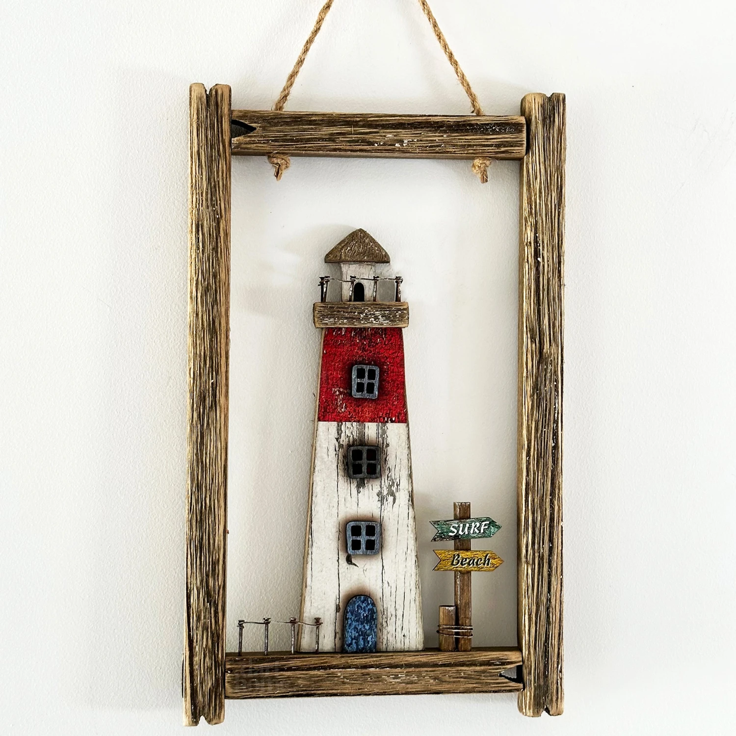 A red and white coastal lighthouse sitting on a rectangular rustic . This distressed hanging wall decoration is perfect for neutral bathroom decor to add to the seaside theme and colourway.