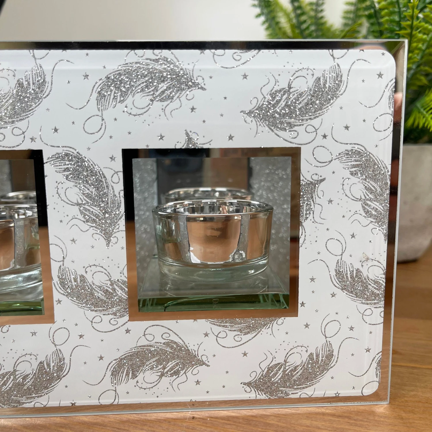 A double tealight holder that will add glamour into your home interior. Boasting a silver glitter feather design with a mirrored trim and chrome silver tea light holders in the centre.