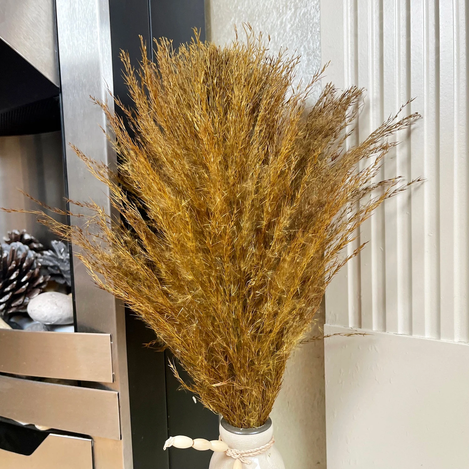 Real gold dried pampas grass in a crackled ceramic vase. A colourful fluffy houseplant that will brighten a wedding or dining table with ease and instil natural style to your interior.