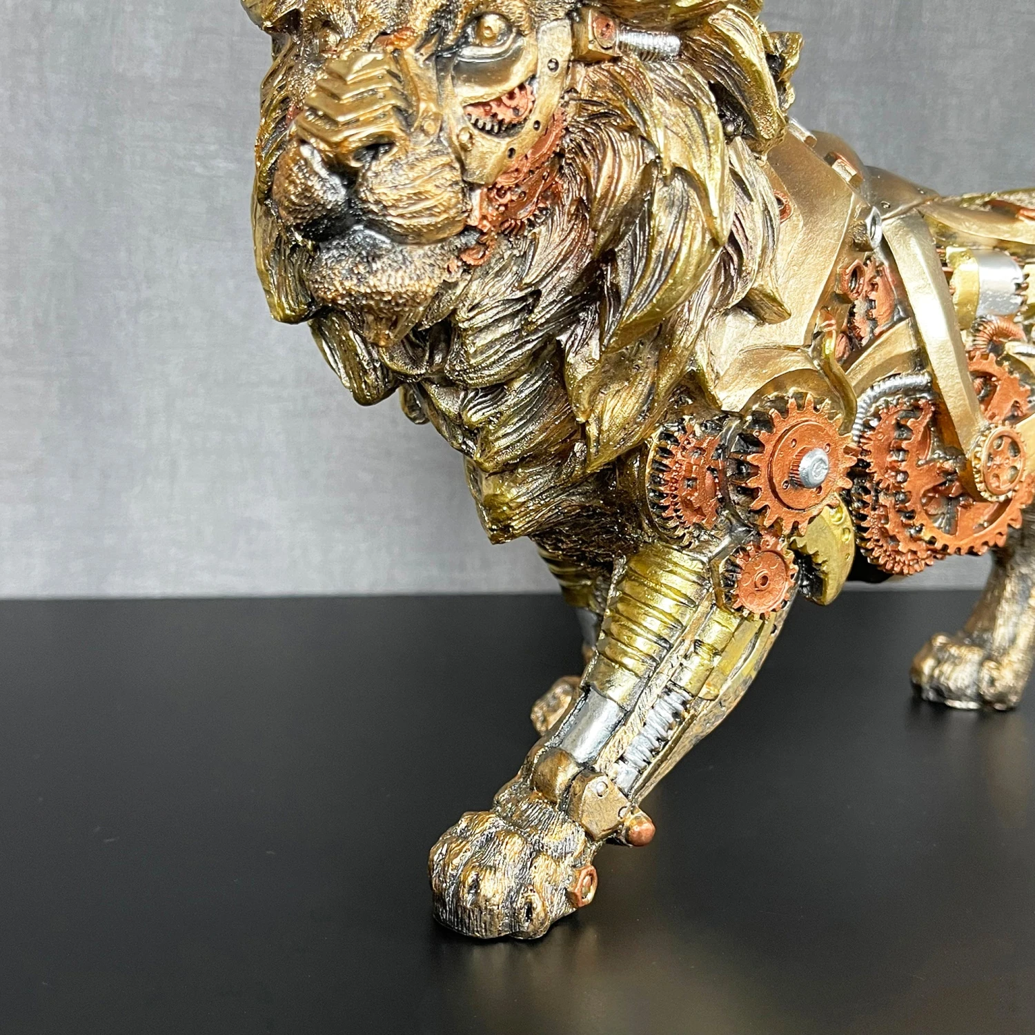 Highly detailed industrial ornament showcasing a proud walking lion in a classic steampunk design. Golden lion featuring gold and bronze coloured mechanics. Gift idea for a steampunk loving friend.