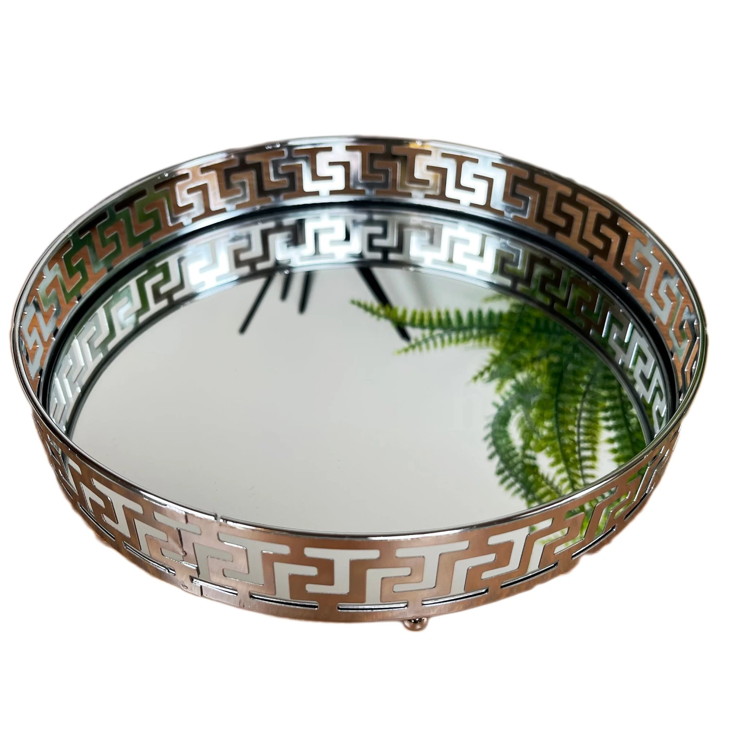 Crafted with glass and metal, this opulent silver round 21cm diameter mirrored tray boasts a classic greek key patterned metal frame and adds a vintage touch to this modern decorative candle tray. Also available in large 31cm diameter.
