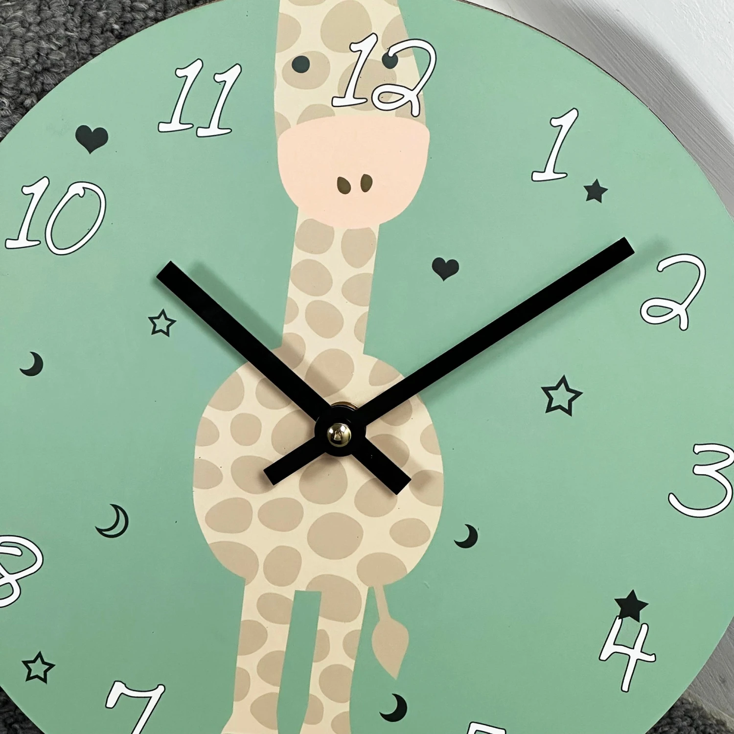 Add a fun touch to your childrens bedroom with this Giraffe wall clock in an animated style. With an eye catching grey face and black hands with a simple, easy to read 12 hour display, this round battery powered clock will be the perfect way to learn to tell the time whilst always showcasing their favourite animal.