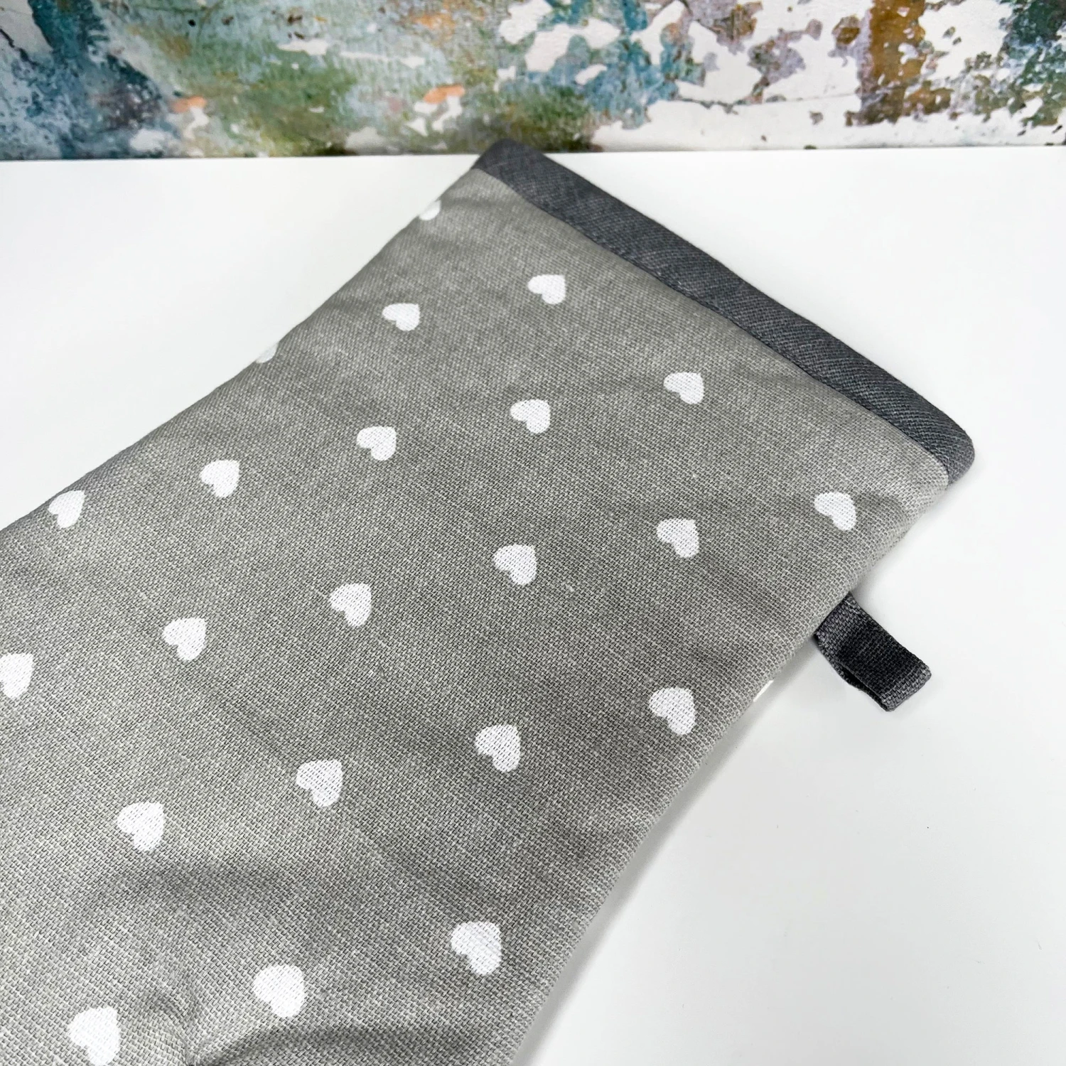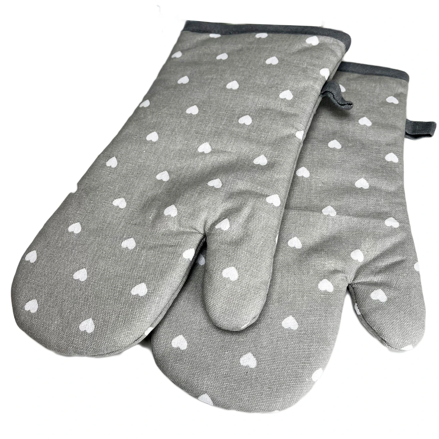 A single oven glove offering a contemporary grey and white love heart design. Made from 100% cotton, this heat resistant mits has a maximum of 10 machine washable cycles and will be a perfect fit for your kitchen decor. Set of 3 tea towels and double oven glove also available.