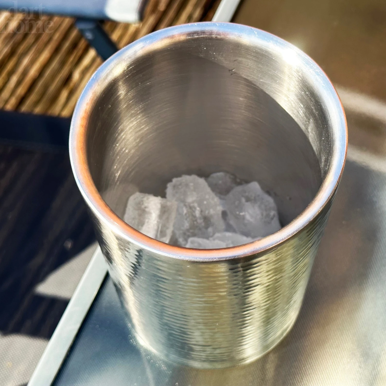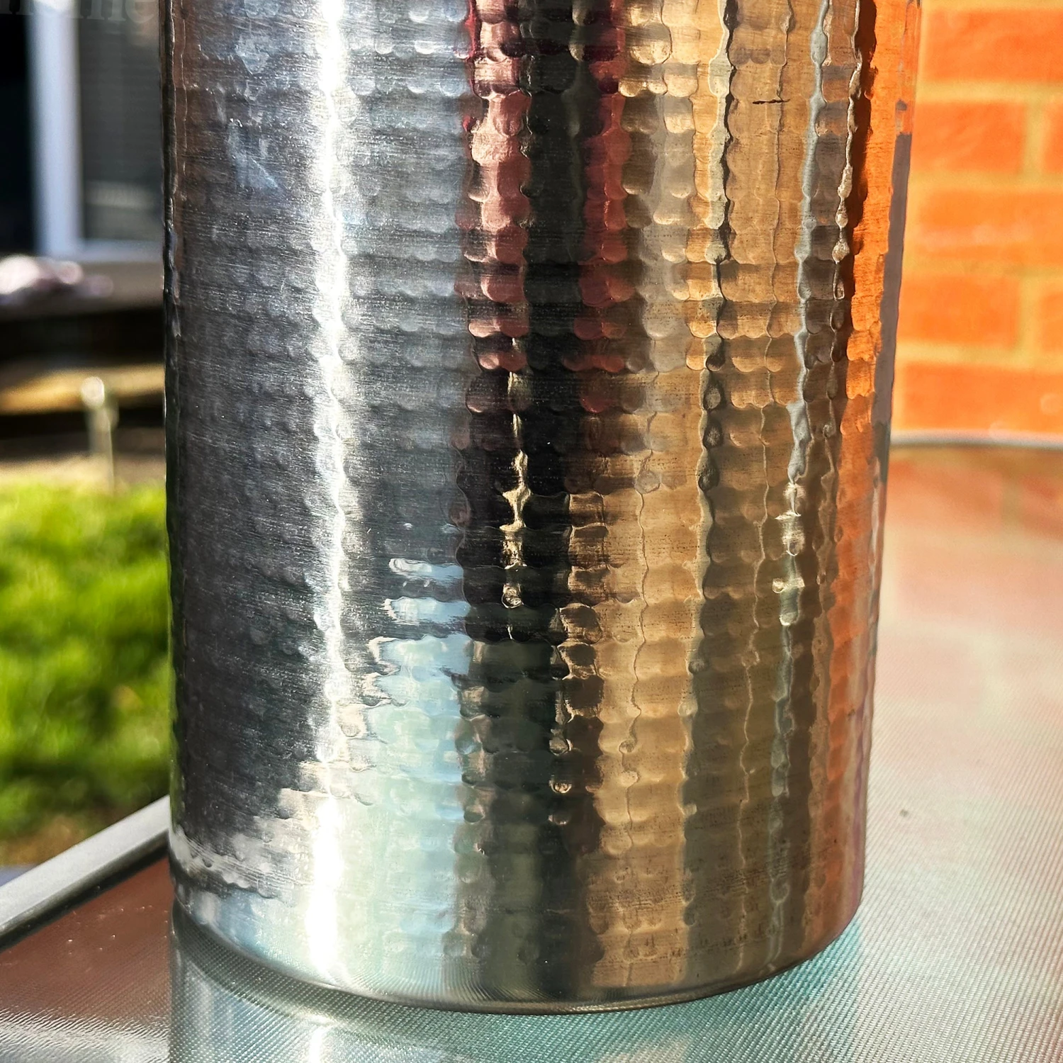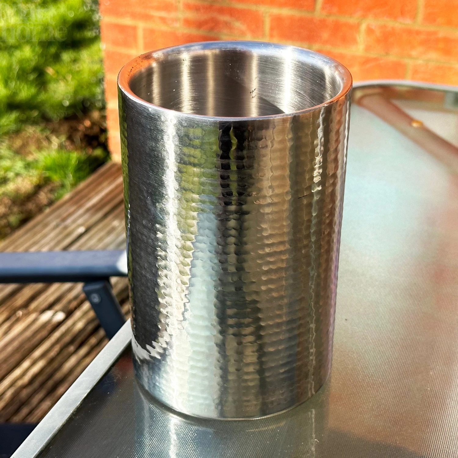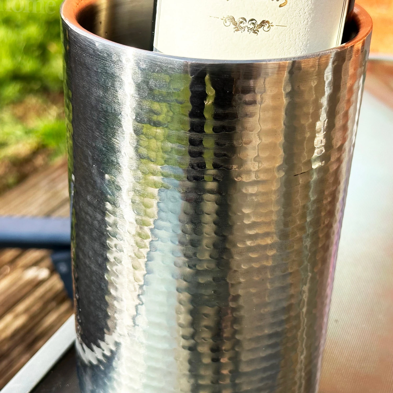 Boasting a thick double wall construction, this single bottle wine cooler will insulate and protect your bottle from the ambient temperature ensuring maximum quality of yours and your guests drinks all night. This wine cooler is made from stainless steel metal with a hammered effect design.