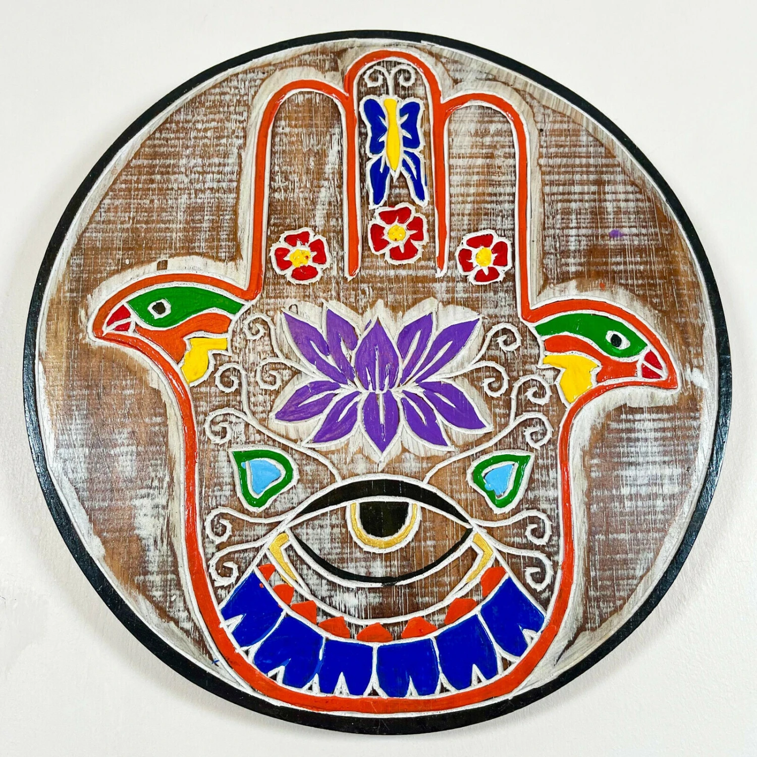 This is a hand carved wall hanging round plaque showcases a hand of fatima spiritual symbol surrounded by decorative patterns. This plaque will be perfect for your home or bedroom.