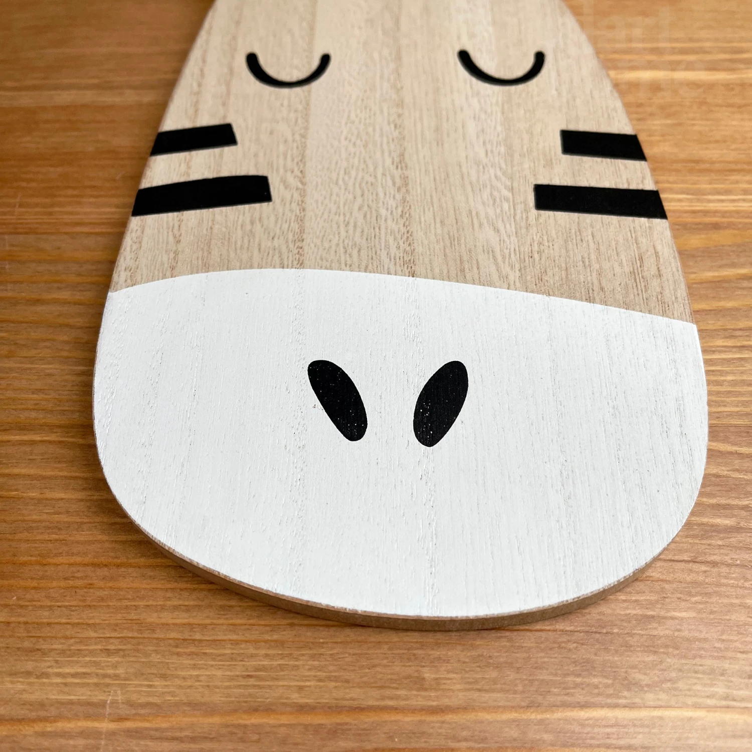 Animal shaped hanging plaque, featuring a round brown zebra head with black and white facial features. A wall hanging decorative plaque that is perfect for a childrens bedroom. Handmade and hand finished from wood.