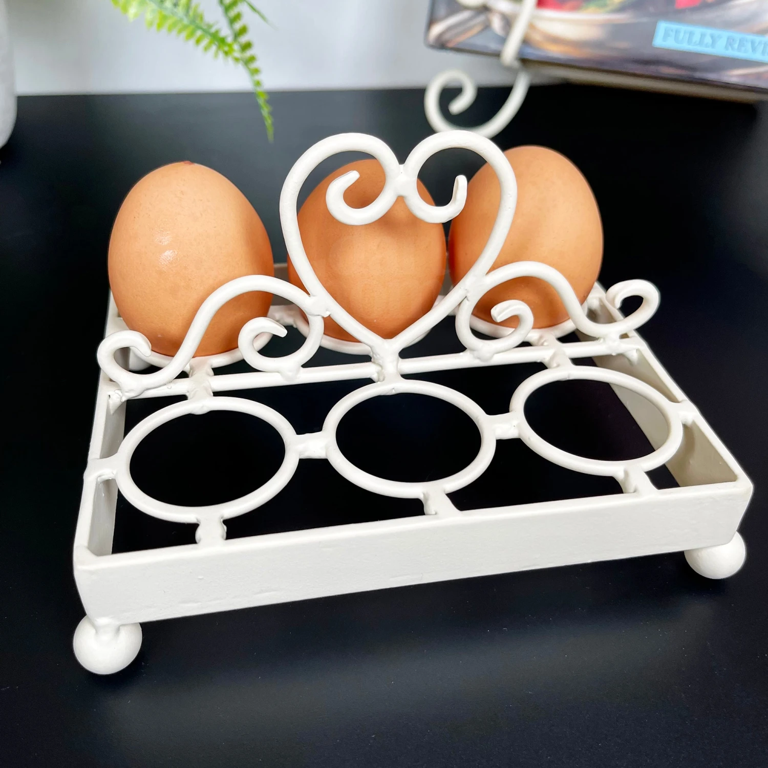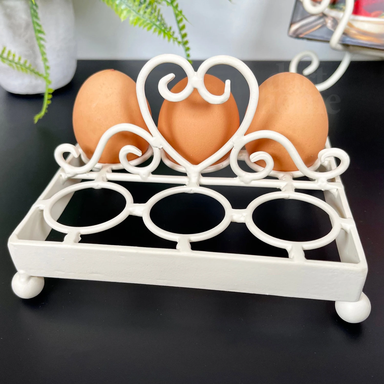 A shabby chic style egg holder in an ivory finish with a 6 egg capacity. This egg holder is made from metal and is an excellent french country themed storage rack that will look great in your kitchen.