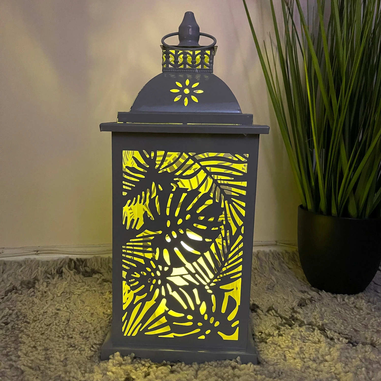 These grey lanterns display a palm leaf design and are filled with an LED candle that beam a warm white light around the room or garden. They are battery powered, requiring 3x AAA batteries (not included). They can be bought individually or as a set of 2 and are a perfect living room or garden light to gently glow in a space. Do not leave outside.