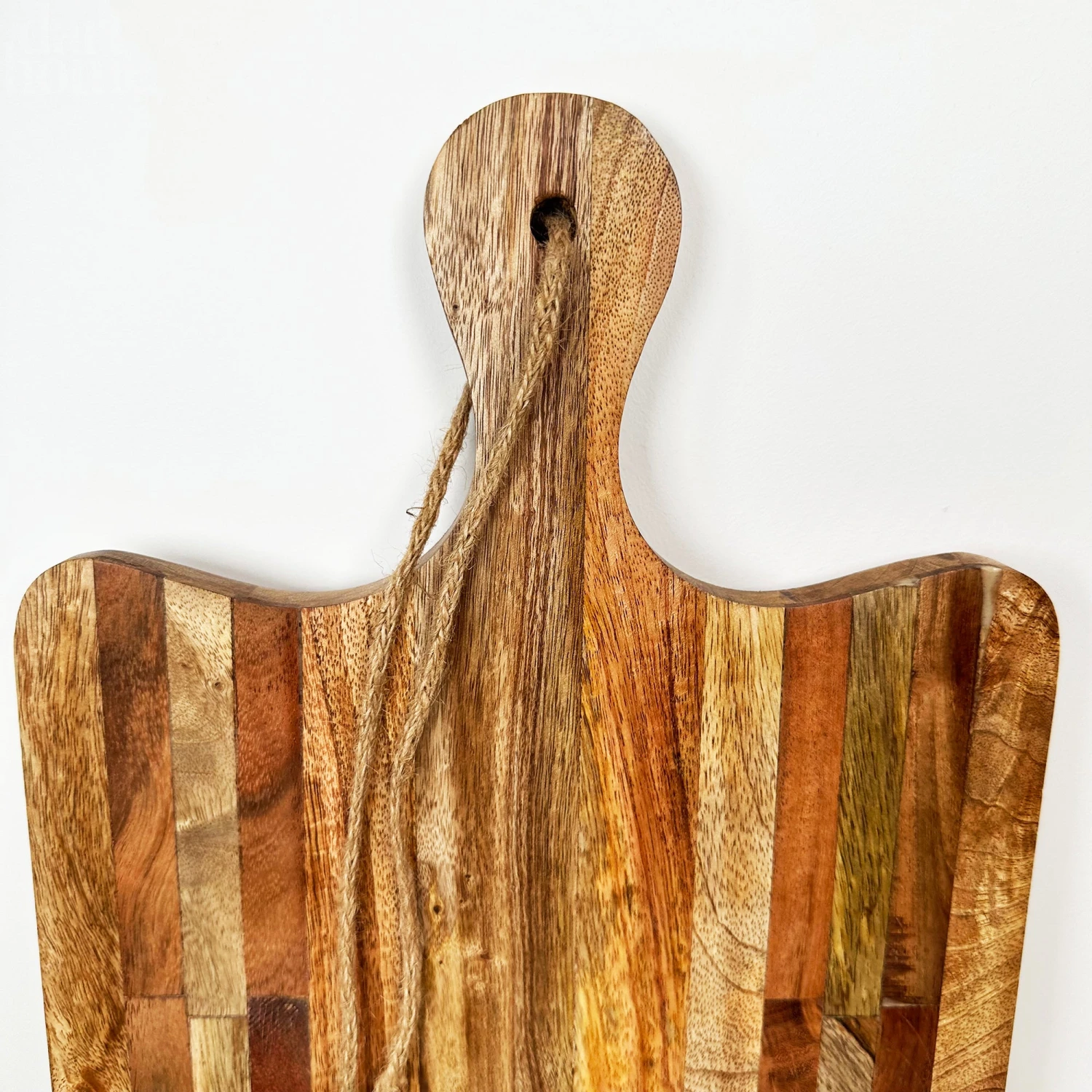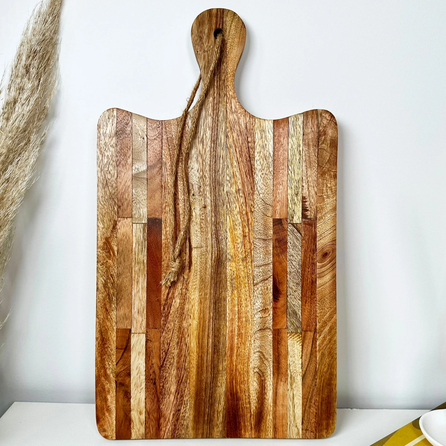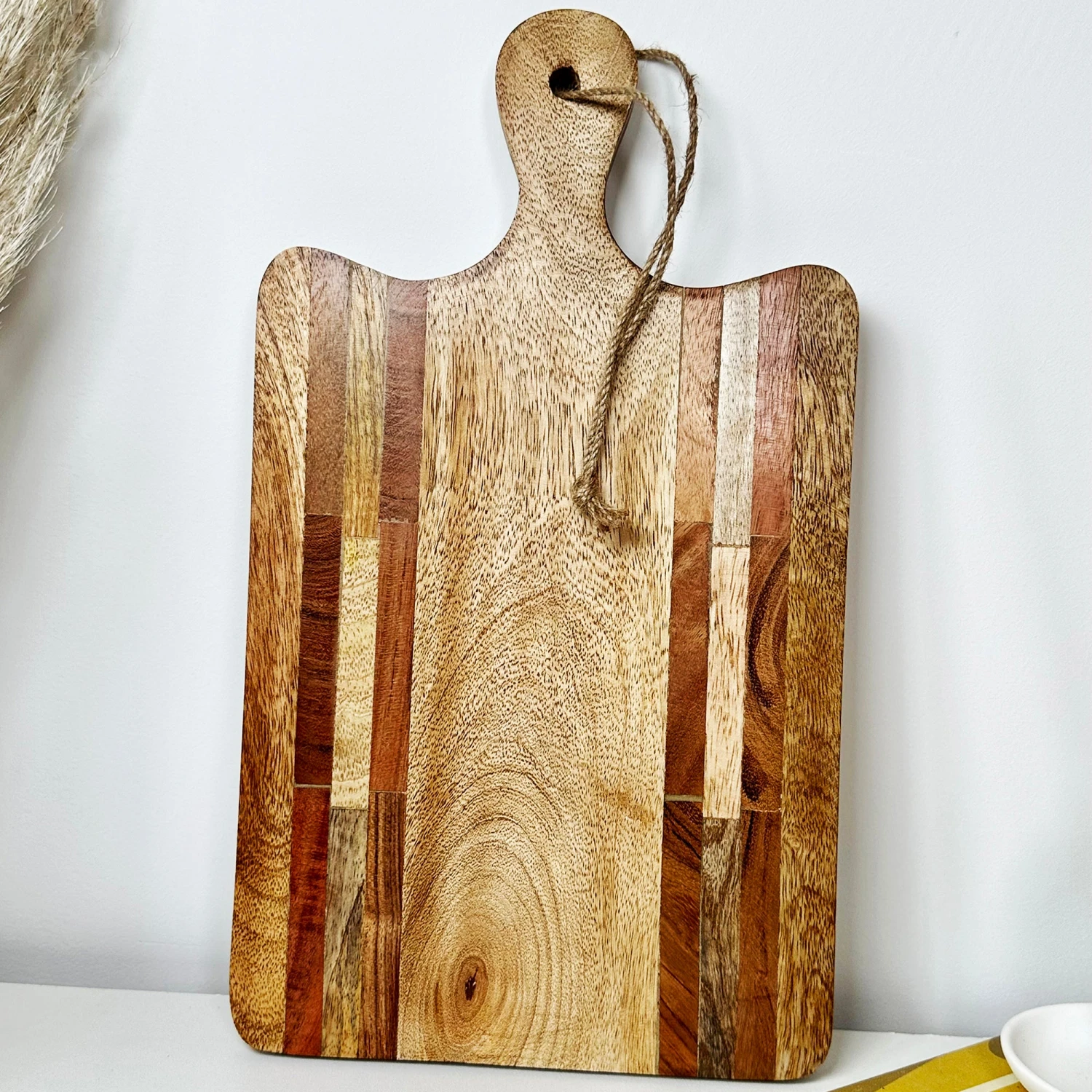These rectangular chopping boards; made from solid mango wood and finished in a brown varnish is not only a practical way to protect counter tops from your chopping, but it also adds a certain rustic sensibility to any cooking space. Wide, rectangular cutting board with a hand carved long handle. Wipe clean and handwash only, food safe.