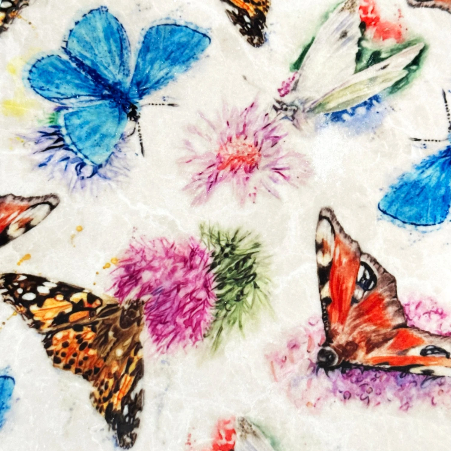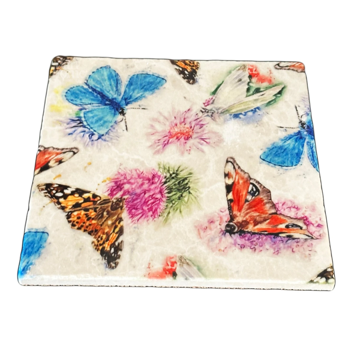 A colorful worktop saver crafted with love, this handmade marble trivet is a unique addition to any kitchen. Using a classic country floral pattern and butterfly accents, it’s perfect for bringing a touch of rustic charm to your dining room and for protecting your worktop from hot pots.