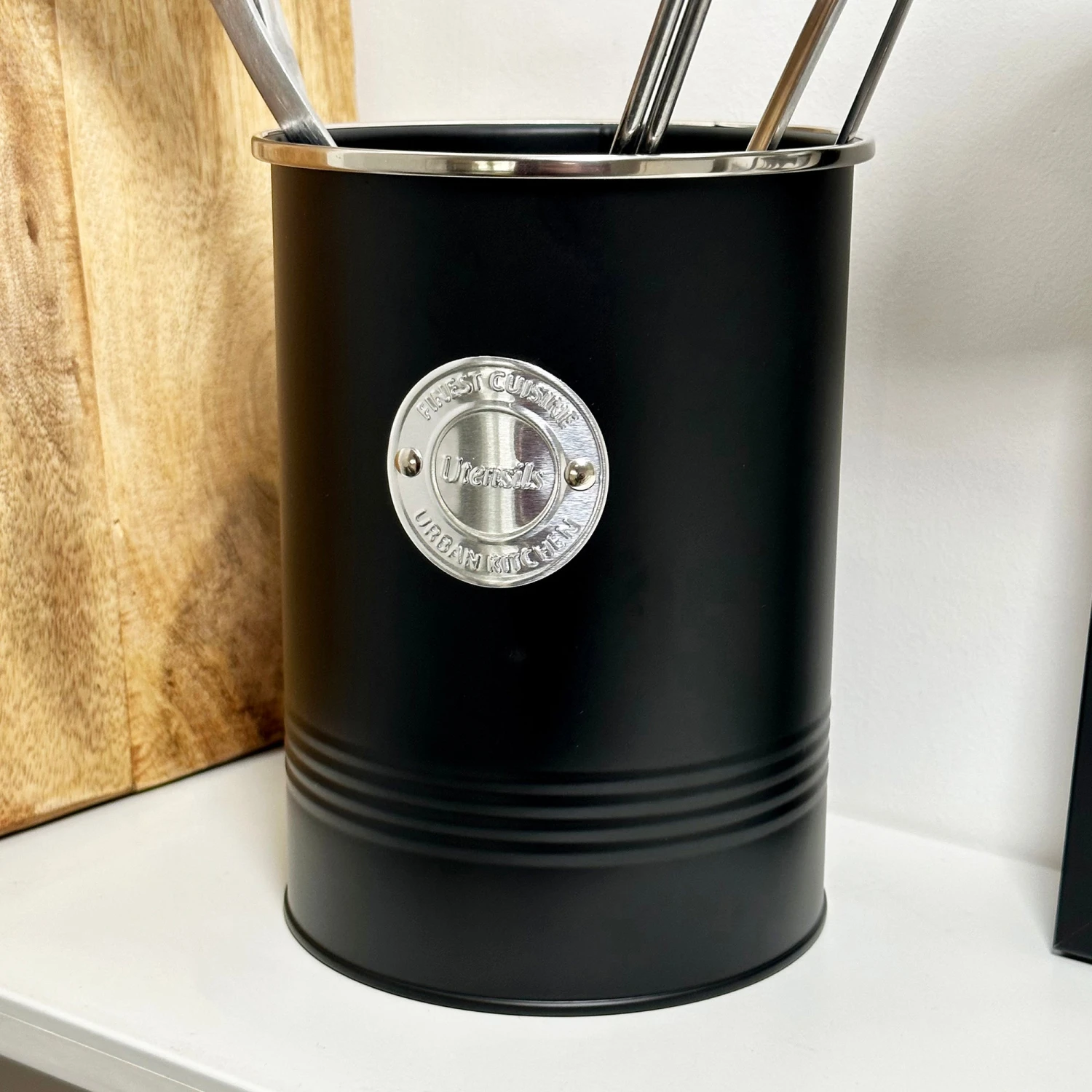 Utensils hlder in a monochrome design, finished with a chrome silver label and rim. A classic, modern style kitchen storage pot that will hold all your essential kitchen utensils and cutlery as well as easily fitting in with your existing kitchen decor. This is a round, easy clean multipurpose storage caddy.