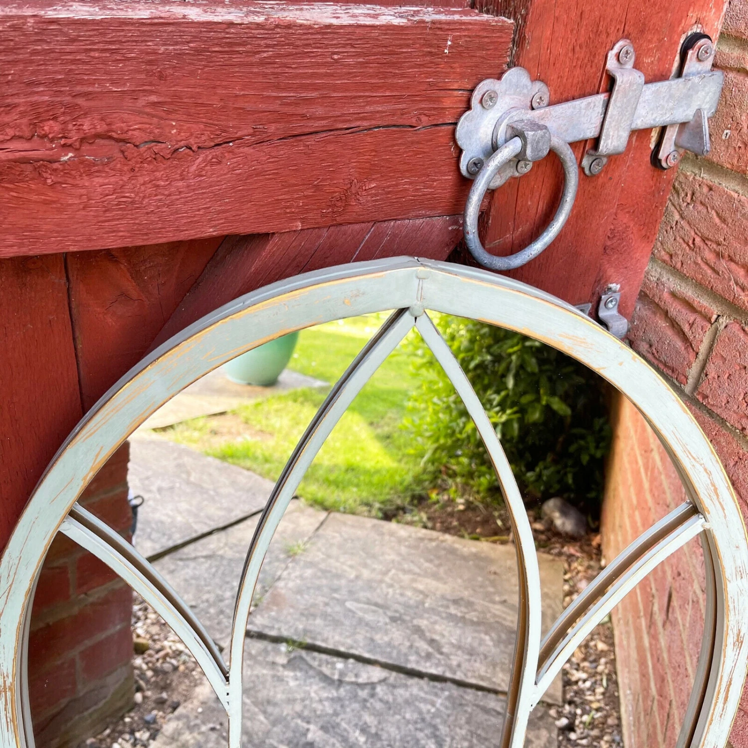 This metal arch wall mirror has a antique style green & copper finish and is perfect to reflect light and add depth to any garden or home.