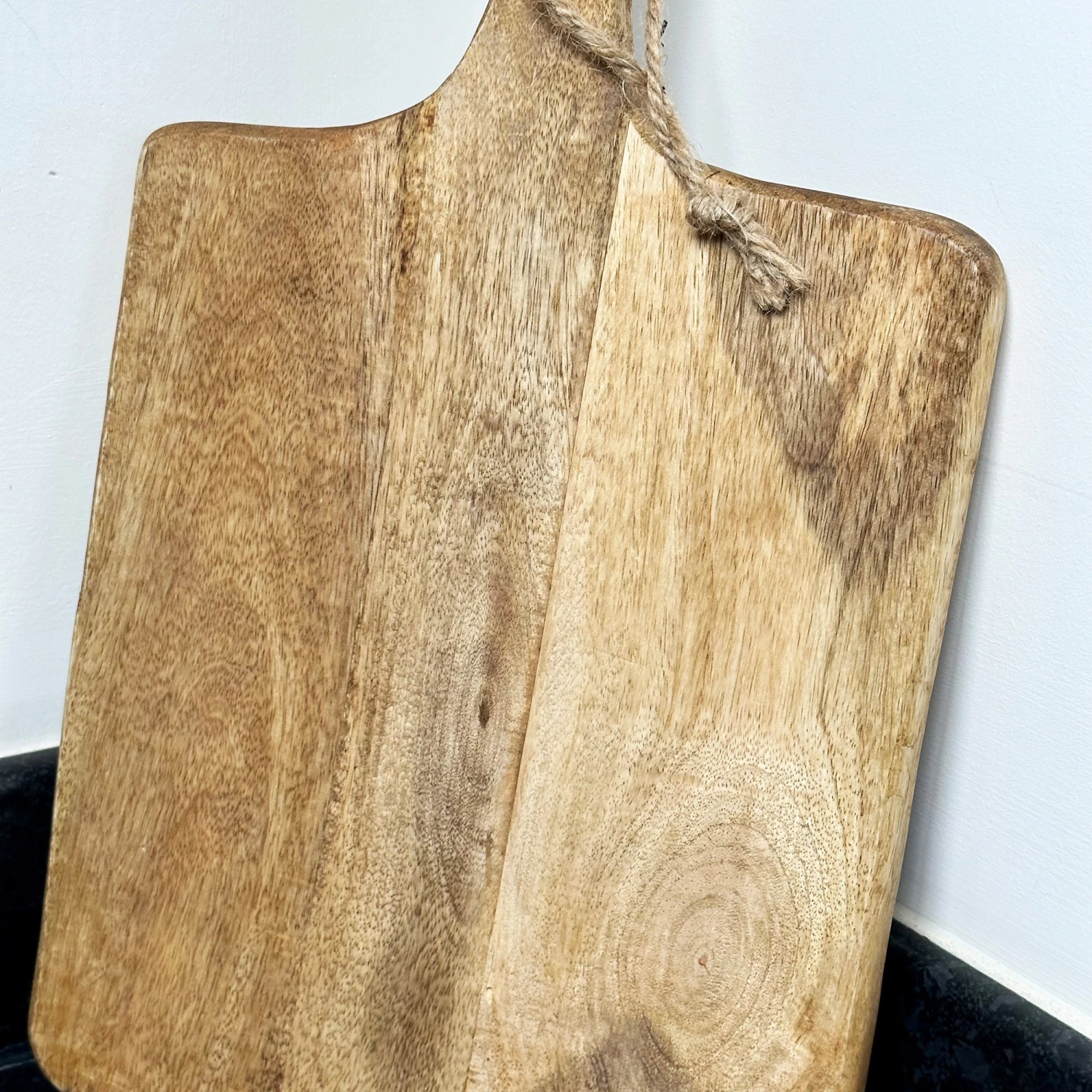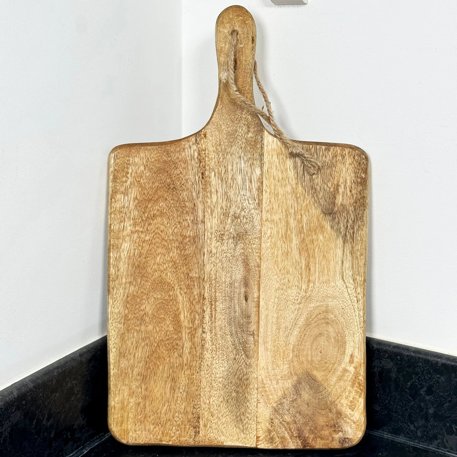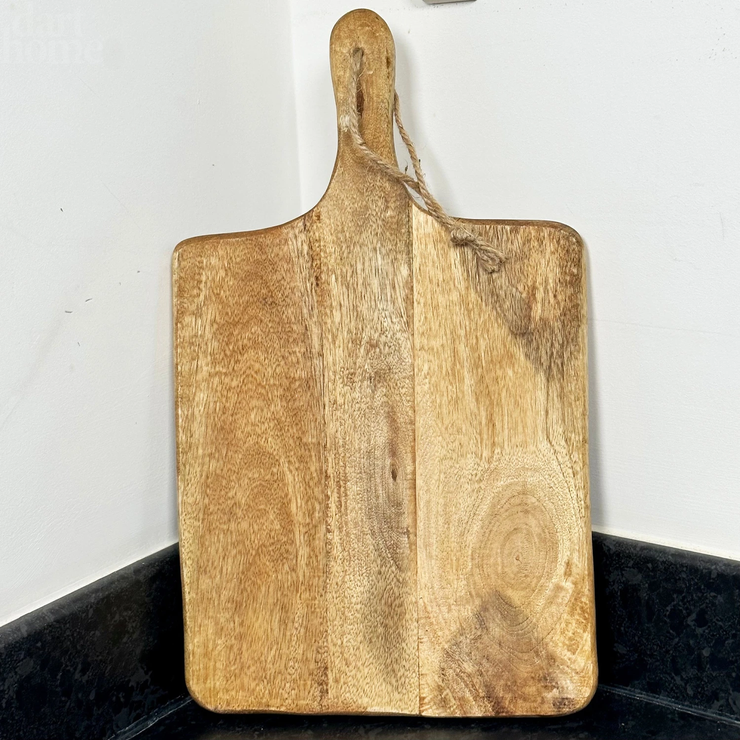 This chopping board; made from solid mango wood and finished in a beautiful natural unvarnished finish is not only a practical way to protect counter tops from your chopping, but it also adds a certain rustic sensibility to any cooking space. Large square cutting board with a long handle and rope hanger. Wipe clean and handwash only, food safe.