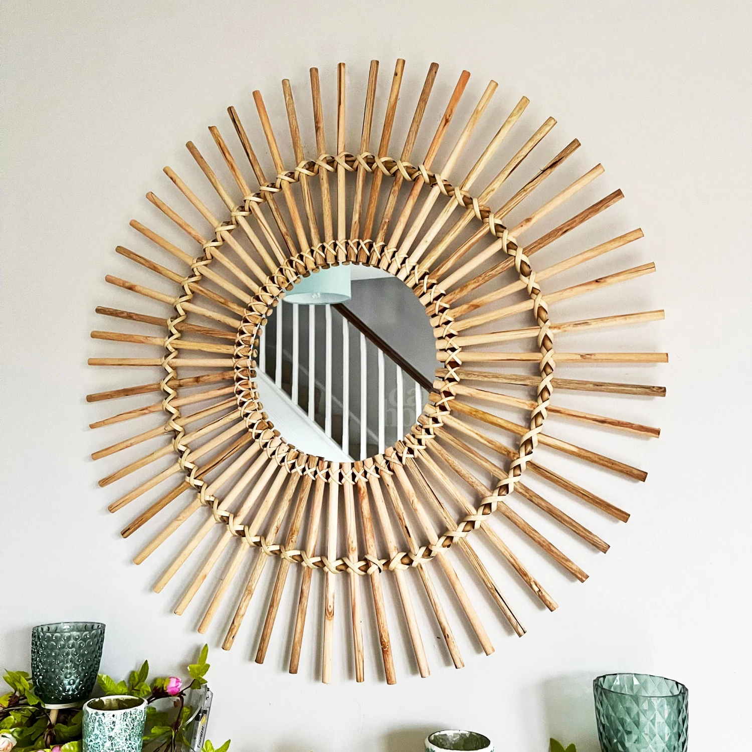 A beautifully hand crafted wall mirror designed with wood and rattan to offer a bohemian style wherever hung. Features a large 80cm diameter frame with a 26cm round interior mirror. Perfect for hallway or fireplace display.