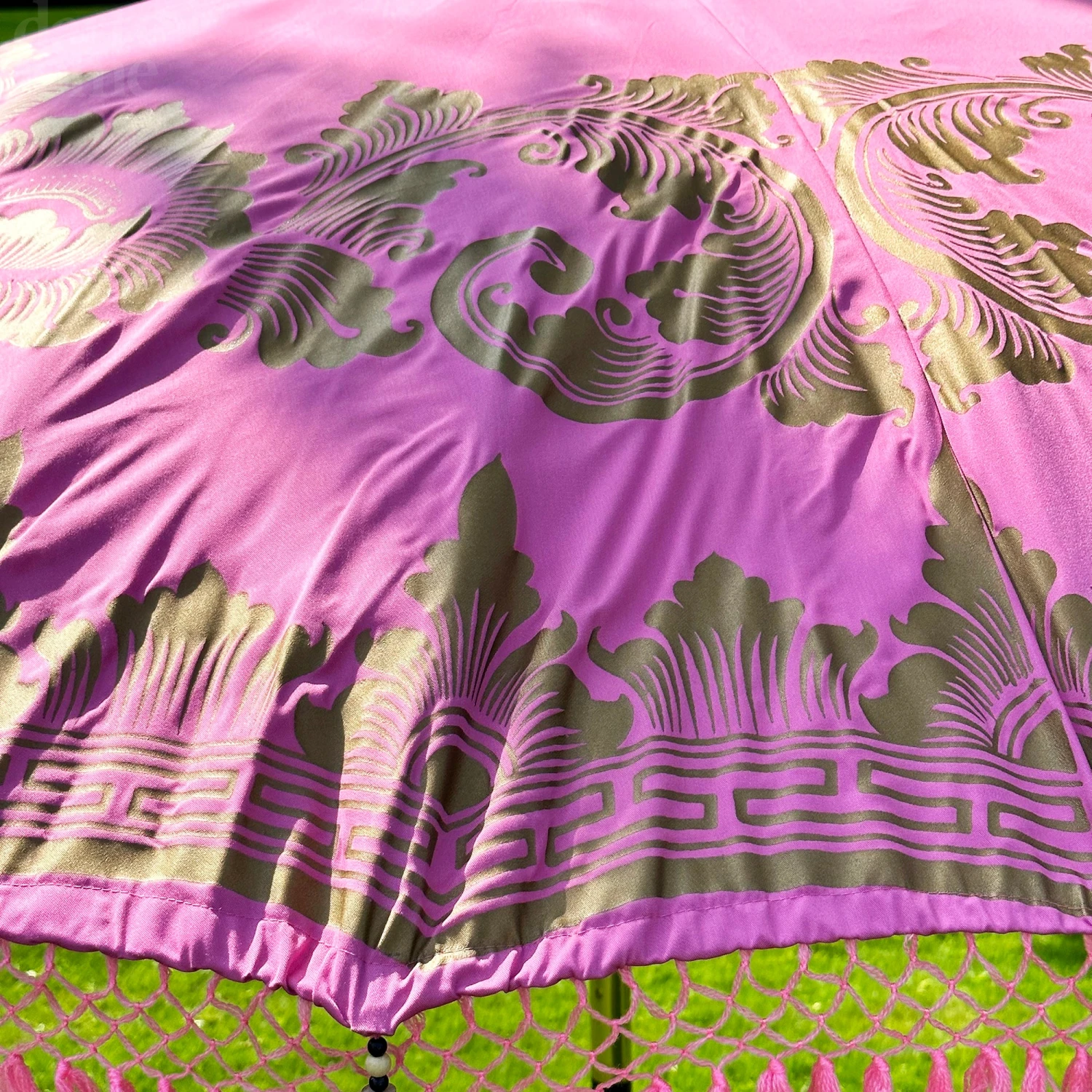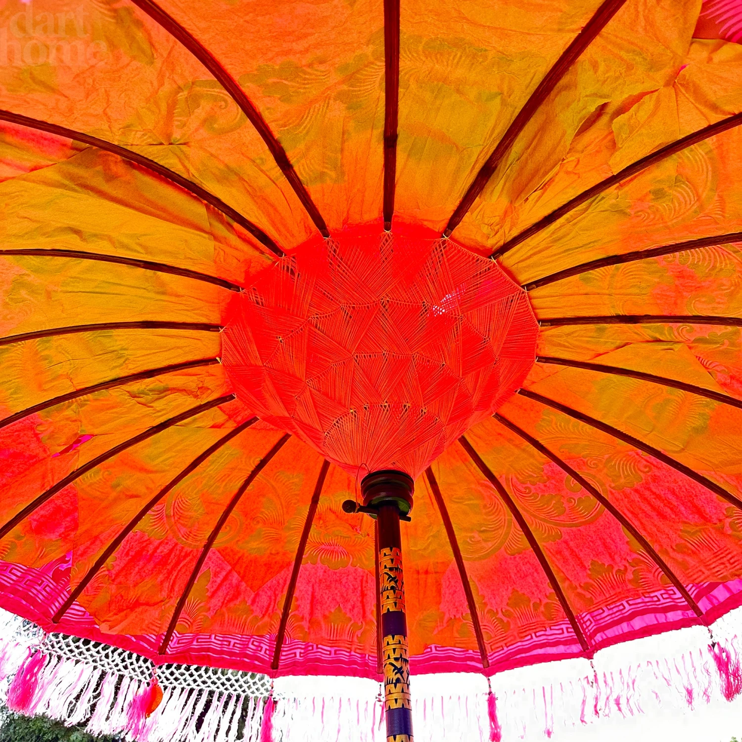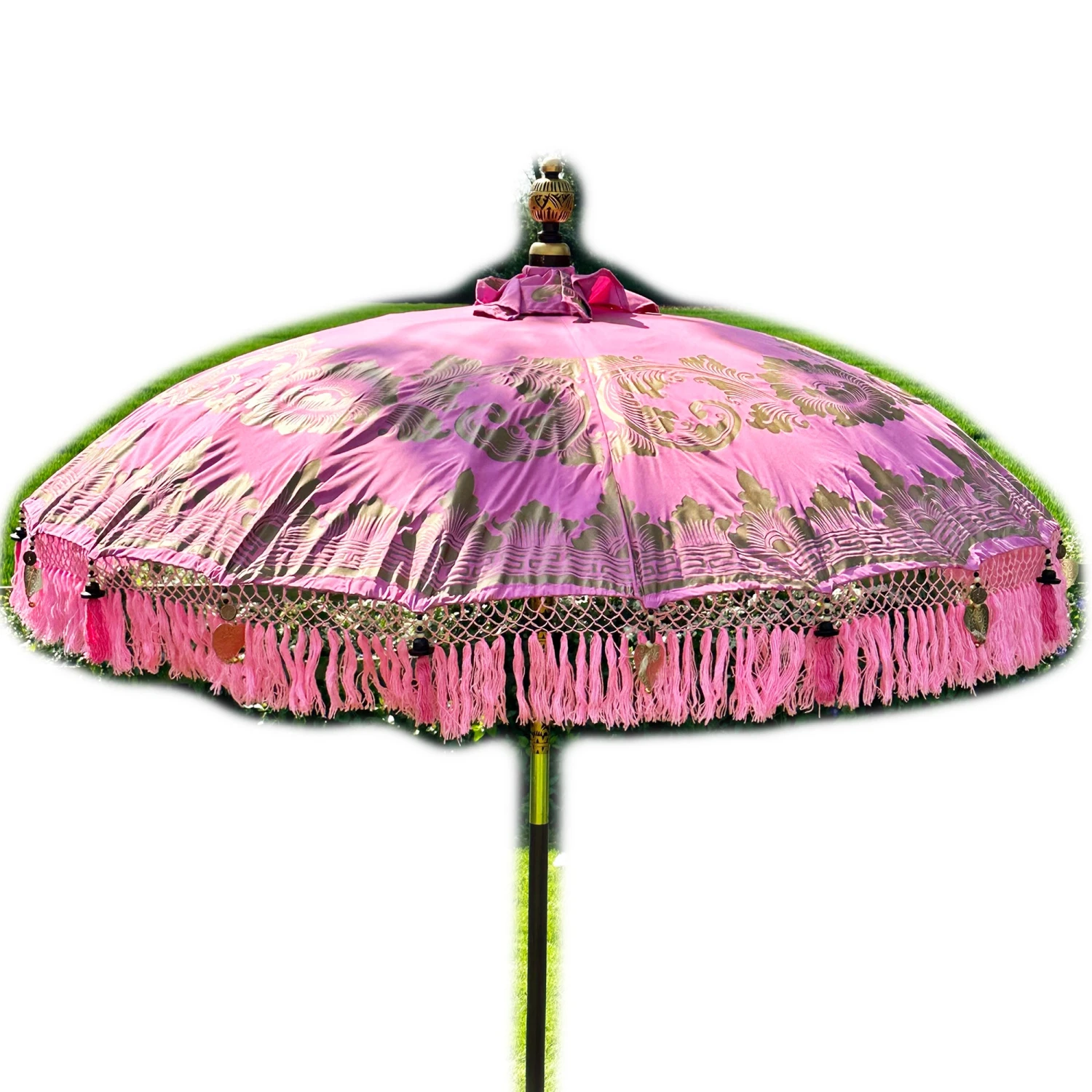 These beautiful bali sun parasols feature a beautiful golden Batik detail and are a traditional ceremonial balinese decoration that glisten when the sun shines on them. They are completely handmade, being hand carved, hand woven and hand printed.