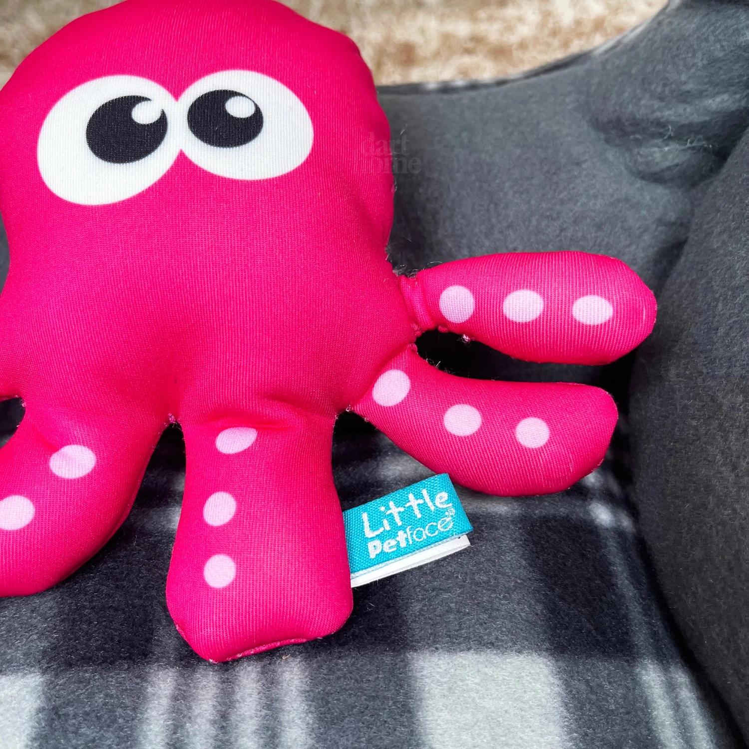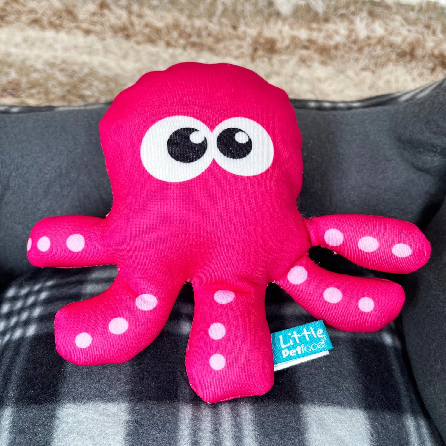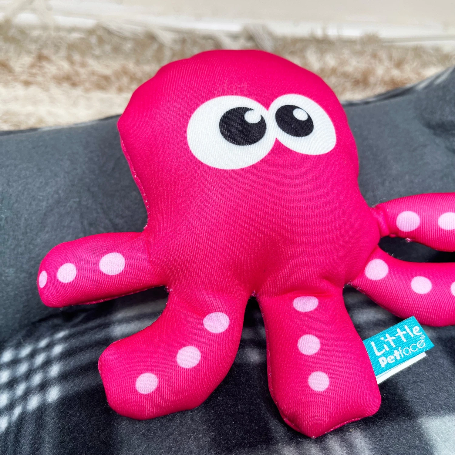 Floating octopus character dog toy provides a combination of durable materials and interactive fun to allow the dog and their owner an enjoyable shared play experience. For use in and out of water!
