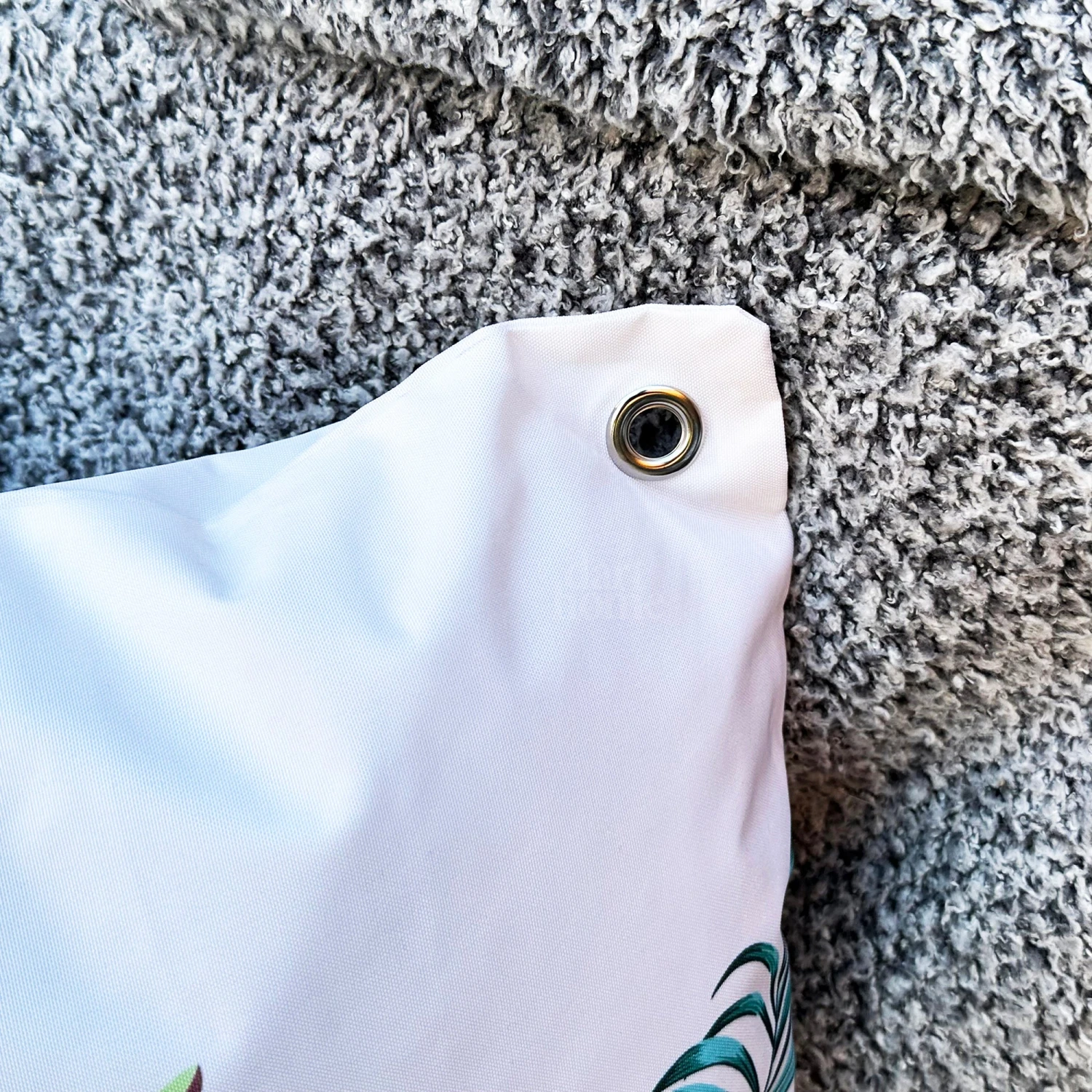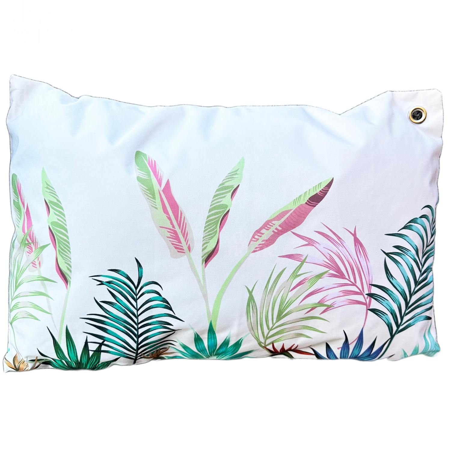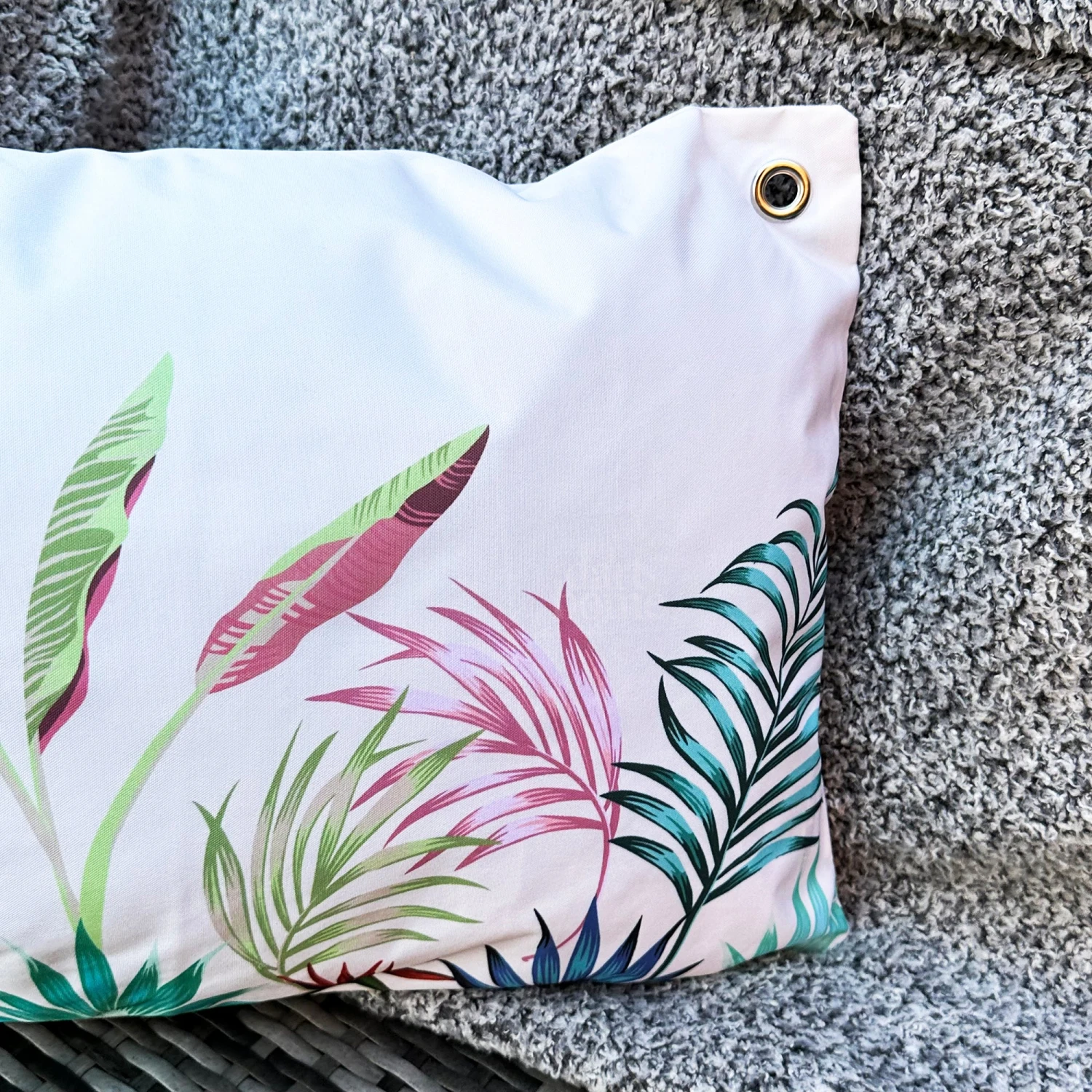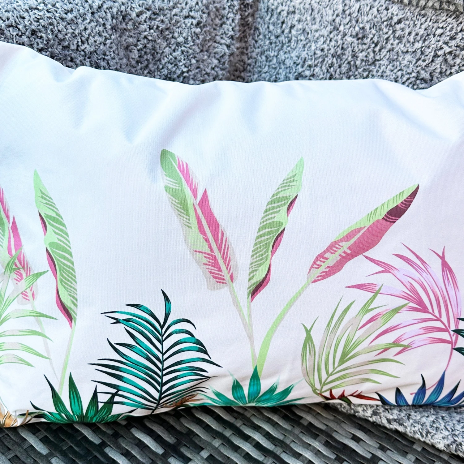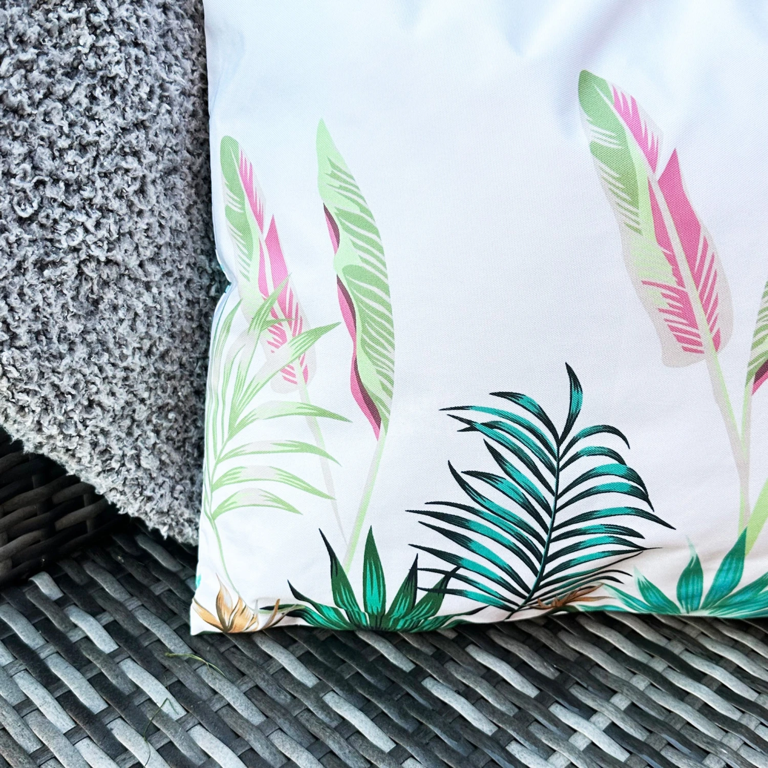 A filled, waterproof multicoloured outdoor cushion featuring a tropical leaf forest scene design filled with pink, green and blue leaves. Zip closure to protect the waterpoof padding. Made using 100% Polyester. Soft and comfortable pillow that is perfect for all furniture in your garden.