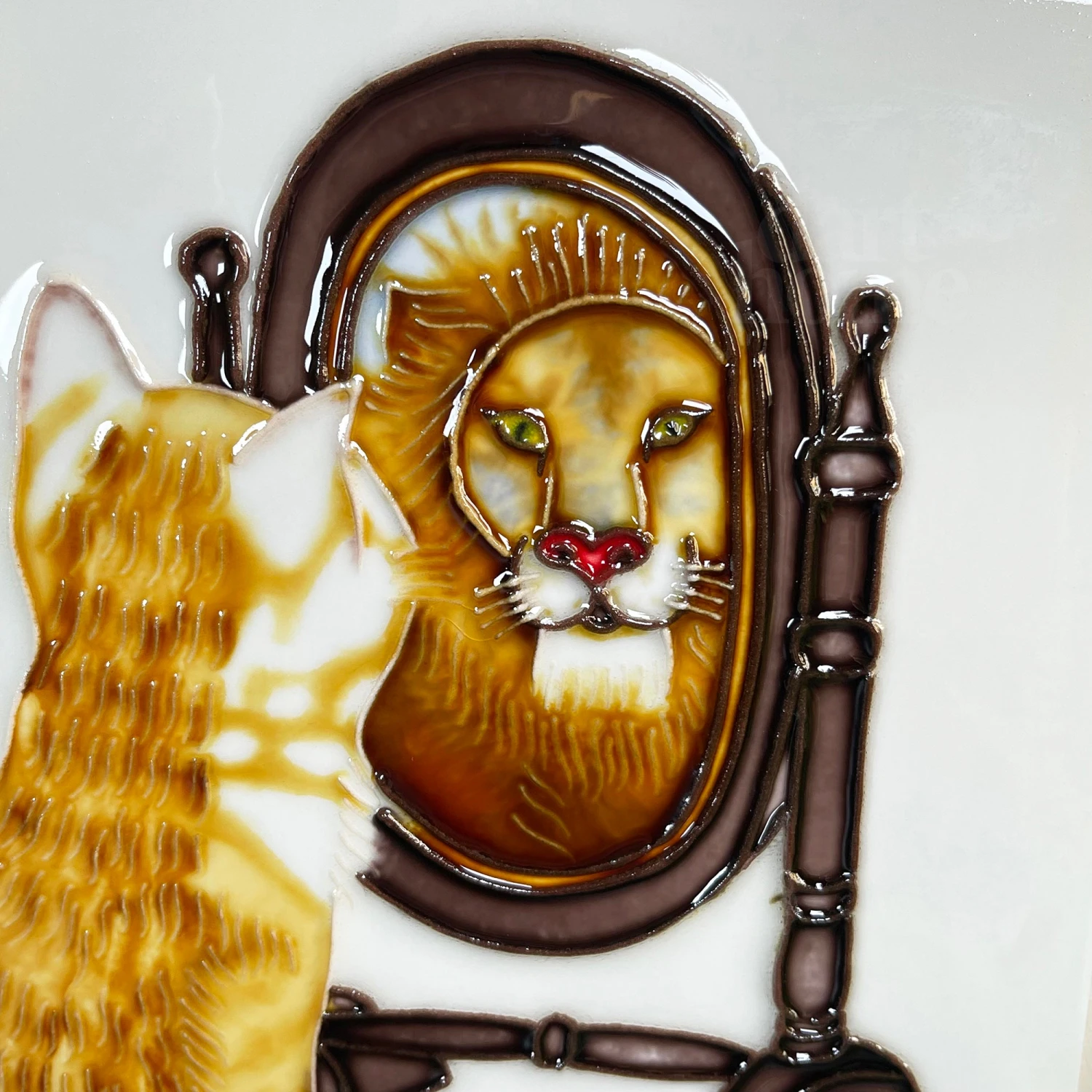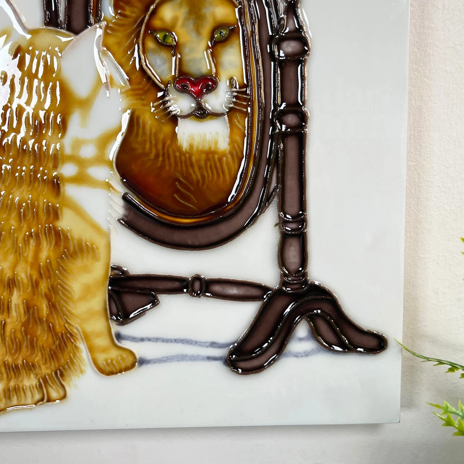 This beautiful square ceramic art tile captures a cat in the mirror seeing the reflection of yourself. This eye catching decorative plaque is a constant reminder to always love yourself and to never lose sight of who you truly are. This art piece is made from ceramics with a glazed finish. The tile has perfect attention to detail which will go above and beyond to enhance a bathroom wall.